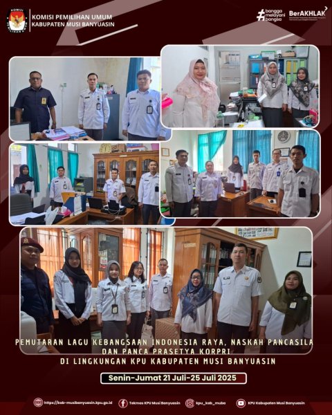 #Teman Pemilih, Komisioner dan Sekretariat KPU Kabupaten Musi Banyuasin Mendengarkan lagu kebangsaan Indonesia Raya, naskah Pancasila dan naskah Prasetya KORPRI di Kantor KPU Kabupaten Musi Banyuasin sebagai rutinitas kegiatan dalam menindaklanjuti Surat
