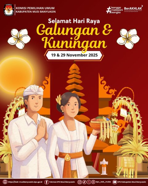 #TemanPemilih, KPU Kabupaten Musi Banyuasin mengucapkan Selamat Hari Raya Galungan dan Kuningan Tahun 2025. Semoga kemenangan Dharma atas Adharma menginspirasi untuk terus bekerja penuh integritas.