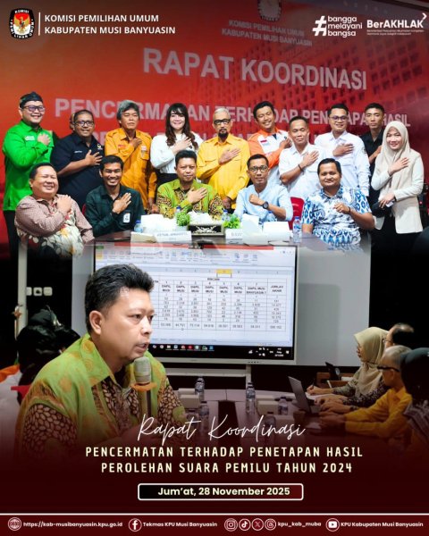 #TemanPemilih, KPU Kabupaten Musi Banyuasin melaksanakan Rapat Koordinasi Pencermatan terhadap penetapan hasil Perolehan Suara Pemilihan Umum Tahun 2025 bersama BAWASLU Kabupaten Musi Banyuasin dan Pimpinan Partai Politik Peserta Pemilihan Umum Kabupaten Musi Banyuasin.