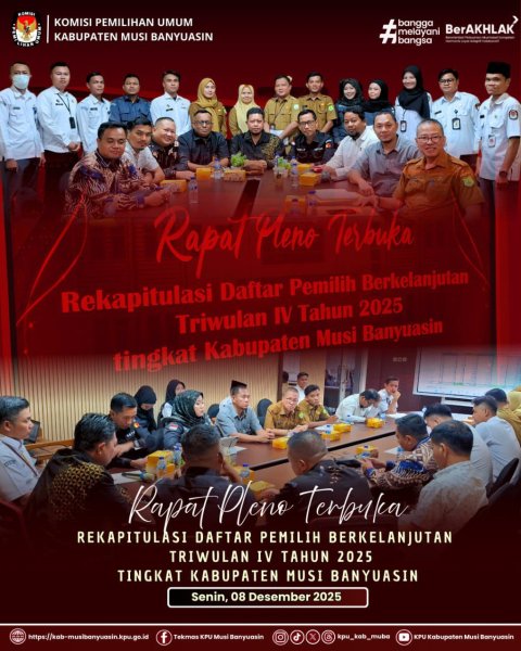 #TemanPemilih, KPU Kabupaten Musi Banyuasin menggelar Rapat Pleno Terbuka Rekapitulasi Pemuktahiran Data Pemilih Berkelanjutan (PDPB) Triwulan IV tingkat Kabupaten Musi Banyuasin.