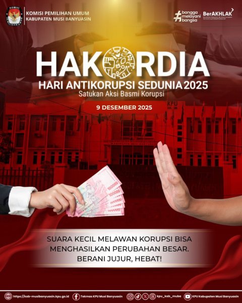 #TemanPemilih, KPU Kabupaten Musi Banyuasin mengucapkan Selamat Memperingati Hari Anti Korupsi Sedunia! Satukan aksi Basmi Korupsi.