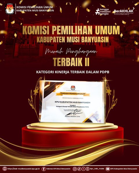 Kali ini, KPU Kabupaten Musi Banyuasin meraih Penghargaan Terbaik II Kategori Kinerja Terbaik dalam penyelesaian PDPB.
