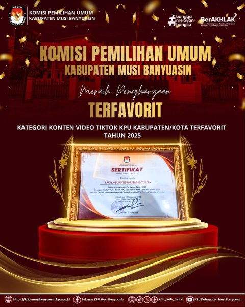 KPU Kabupaten Musi Banyuasin meraih Penghargaan Terfavorit Kategori Konten Tiktok KPU Kabupaten/Kota Tahun 2025.
