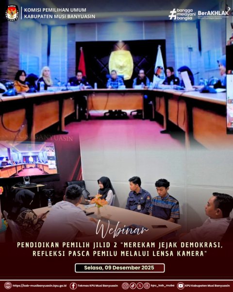 #TemanPemilih, KPU Kabupaten Musi Banyuasin Mengikuti Webinar Pendidikan Pemilih Jilid 2 dengan tema "Merekam Jejak Demokrasi, Refleksi Pasca Pemilu Melalui Lensa Kamera" yang dilaksanakan oleh KPU Provinsi Sumatera Selatan secara daring. Selasa, 09/12/2025