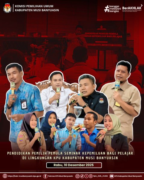 #TemanPemilih, KPU Kabupaten Musi Banyuasin melaksanakan kegiatan Pendidikan Pemilih Pemula melalui Seminar Kepemiluan yang diikuti oleh para pelajar dari berbagai sekolah di Kecamatan sekayu. Kegiatan ini bertujuan untuk memberikan pemahaman sejak dini tentang pentingnya partisipasi generasi muda dalam proses demokrasi. Rabu, 10/12/2025