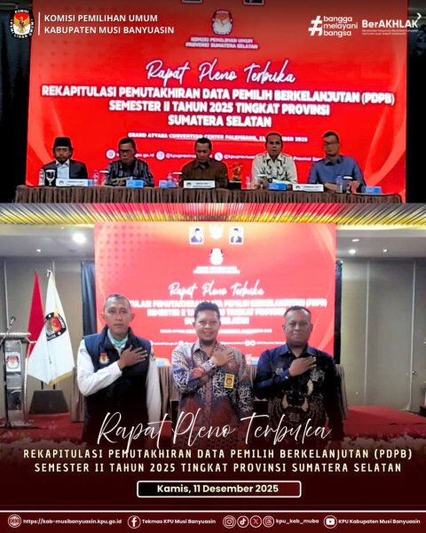 #TemanPemilih, Ketua didampingi Anggota Divisi Perencanaan, Data dan Informasi dan Operator Sidalih KPU Kabupaten Musi Banyuasin megikuti Rapat Pleno Terbuka Rekapitulasi Pemutakhiran Data Pemilih Berkelanjutan (PDPB) Semester II Tahun 2025 Tingkat Sumatera Selatan yang di laksanakan oleh KPU Provinsi Sumatera Selatan bertempat di Grand Atuasa Convention Center Palembang. Kamis 11/12/2025