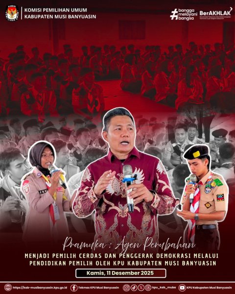 #TemanPemilih, Plt. Sekretaris KPU Kabupaten Musi Banyuasin mengisi acara sebagai Narasumber serta Menghadiri Upacara Pembukaan Kegiatan Latihan Gabungan Satuan Karya dan Bela Negara Tingkat Kwartir Cabang Gerakan Pramuka Musi Banyuasin Tahun 2025 bertempat di Bumi Perkemahan Pandu Kinasih Desa Sumber Harum Kwartir Ranting Kecamatan Tungkal Jaya. Kamis, 11/12/2025