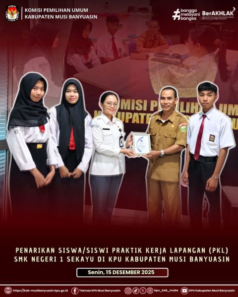 KPU Kabupaten Musi Banyuasin resmi mengakhiri masa Praktik Kerja Lapangan (PKL) siswa/i SMKN 1 Sekayu yang berlangsung sejak 23 Juni hingga 12 Desember 2025.