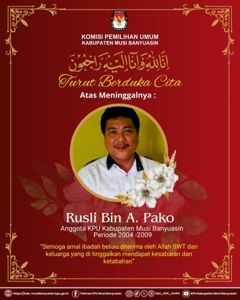 Segenap Keluarga Besar KPU Kabupaten Musi Banyuasin mengucapkan turut berduka cita atas meninggalnya almarhum. Semoga almarhum husnul khotimah dan keluarga yang ditinggalkan diberikan ketabahan..
