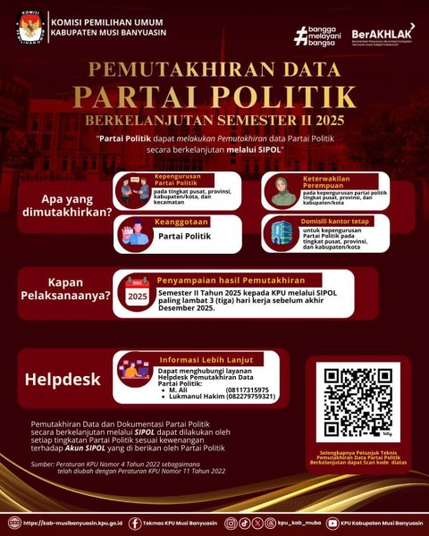 #TemanPemilih, KPU Kabupatem Musi Banyuasin mengumumkan pembaruan data partai politik yang dilakukan secara berkelanjutan melalui Sistem Informasi Partai Politik (SIPOL).