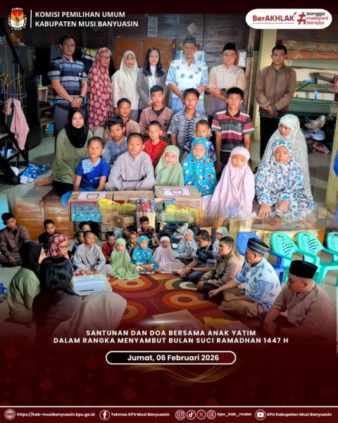 #TemanPemilih, Dalam rangka menyambut Bulan Suci Ramadhan 1447 Hijriah, KPU Kabupaten Musi Banyuasin melaksanakan kegiatan Santunan dan Doa Bersama Anak Yatim sebagai bentuk kepedulian sosial serta upaya mempererat silaturahmi di lingkungan KPU Kabupaten Musi Banyuasin. (Jumat, 06/02/2026)