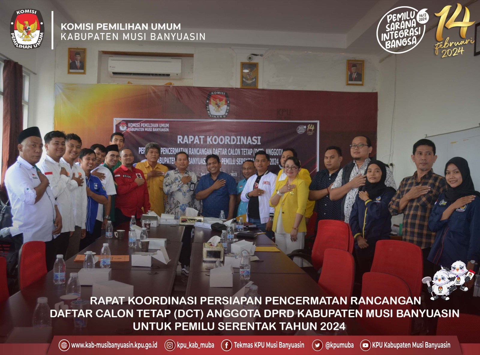 #TemanPemilih, Plh. Ketua KPU Kabupaten Musi Banyuasin Khoirul Anam Membuka Rapat Koordinasi Persiapan Pencermatan Rancangan Daftar Calon Tetap (DCT) Anggota DPRD Kabupaten Musi Banyuasin pada Pemilu Serentak Tahun 2024. di Aula Kuyung Kupek Komisi Pemilihan Umum Kabupaten Musi Banyuasin (Senin, 25 September 2023). Selanjutnya acara di isi dengan penyampaian materi dan diskusi tentang Pencalonan Anggota DPRD Kabupaten/Kota, Kebijakan Pencermatan Rancangan DCT bagi Parpol dan Kebijakan Kebijakan Rancangan DCT bagi KPU Kabupaten /Kota oleh Khoirul Anam Anggota Divisi Teknis Penyelenggaraan serta di tutup dengan sesi foto bersama. Hadir dalam kegiatan ini, LO dan Admin Partai Peserta Pemilu tahun 2024 tingkat Kabupaten Musi Banyuasin, Polres Musi Banyuasin, BAWASLU Musi Banyuasin dan jajaran Sekretariat KPU Kabupaten Musi Banyuasin yaitu PLh. Sekretaris (Yusnan), Kasubbag Hukum dan SDM (Vera Tri Agustina), Staf Pegawai, Staf PPNPN dan Jagat Saksana KPU Kabupaten Musi Banyuasin. #KPUMelayani #PemiluSerentak2024 ------------------------------------ Find Us On: Facebook: Tekmas KPU Musi Banyuasin Instagram: kpu_kab_muba Youtube: KPU Kabupaten Musi Banyuasin Twitter: @kpumuba Website: www.kab-musibanyuasin.kpu.go.id Alamat: Jl. Sekayu - Muara Teladan RT. 035 RW. 010 Kelurahan Balai Agung Kec. Sekayu - Musi Banyuasin.