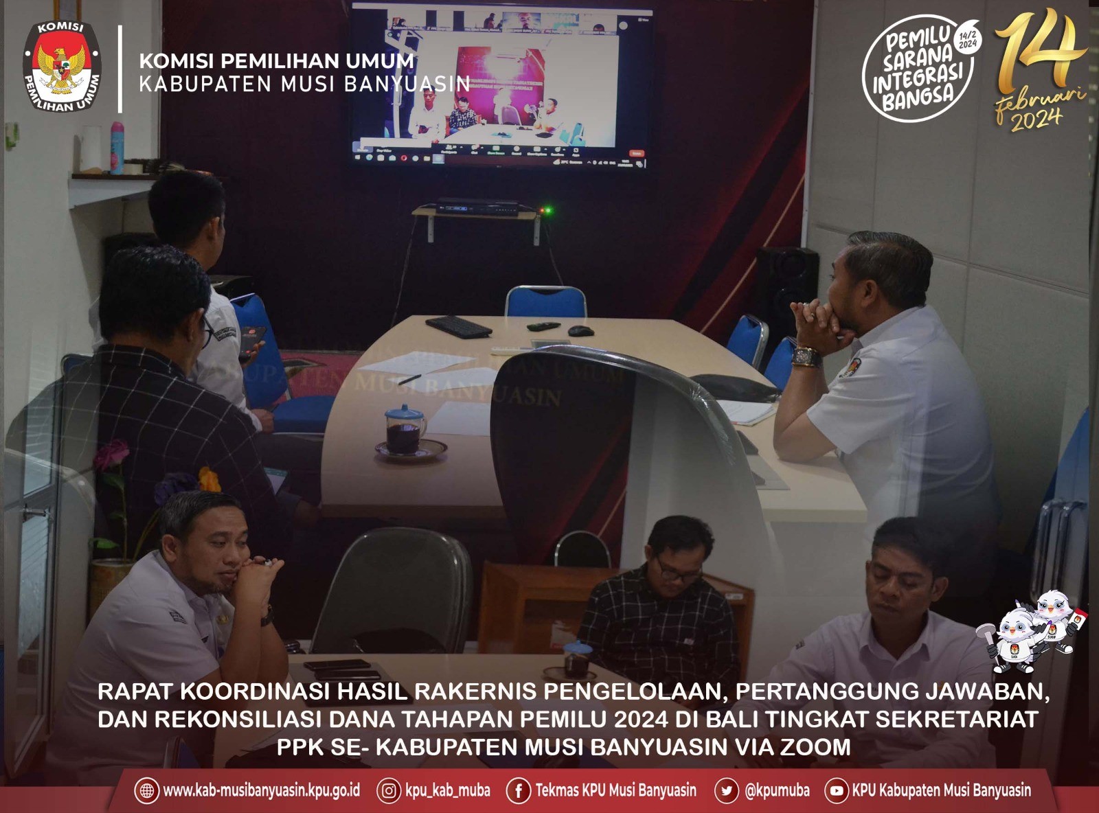 #TemanPemilih, Ketua didampingi Sekretaris dan Kasubbag Keuangan,Umum dan Logistik KPU Kabupaten Musi Banyuasin mengikuti Rapat Koordinasi Hasil Rakernis Pengelolaan, Pertanggungjawaban dan Rekonsiliasi Dana Tahapan Pemilu Tahun 2024 di Bali, bersama Sekretaris, Bendahara dan Staf Sekretariat PPK se- Kabupaten Musi Banyuasin secara daring Via Zoom Meeting, Kamis 27/7/2023.