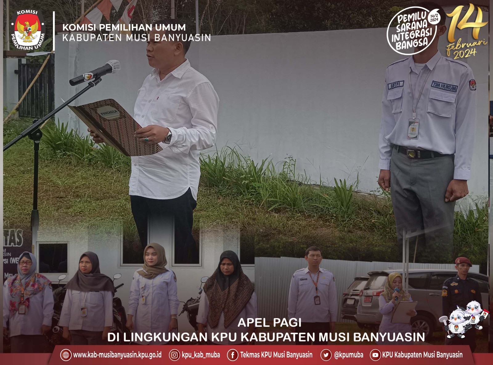 #TemanPemilih, Apel pagi setiap hari Senin, rutin dilaksanakan di lingkungan KPU Kabupaten Kabupaten Musi Banyuasin, Senin (24/07/2023). Pelaksanaan Apel rutin di halaman Kantor KPU Kabupaten Musi Banyuasin pada pukul 08.00 WIB dimulai dengan mendengarkan lagu Indonesia Raya, pembacaan UUD 1945, pembacaan Naskah Pancasila serta pembacaan Panca Prasetya KORPRI ditutup dengan Pembacaan Doa. Divisi Teknis Penyelenggara (Khoirul Anam) bertindak selaku Pembina Apel Pagi, yang di laksanakan di halaman KPU Kab.MUBA. Upacara ini diikuti Kasubbag, Staf PNS dan Tenaga Pendukung PPNPN di Lingkungan KPU Kab. MUBA. #KPUMelayani #PemiluSetentak2024 ------------------------------------ Find Us On: Facebook: Tekmas KPU Musi Banyuasin Instagram: kpu_kab_muba Youtube: KPU Kabupaten Musi Banyuasin Twitter: @kpumuba Website: www.kab-musibanyuasin.kpu.go.id Alamat: Jl. Sekayu - Muara Teladan RT. 035 RW. 010 Kelurahan Balai Agung Kec. Sekayu - Musi Banyuasin.