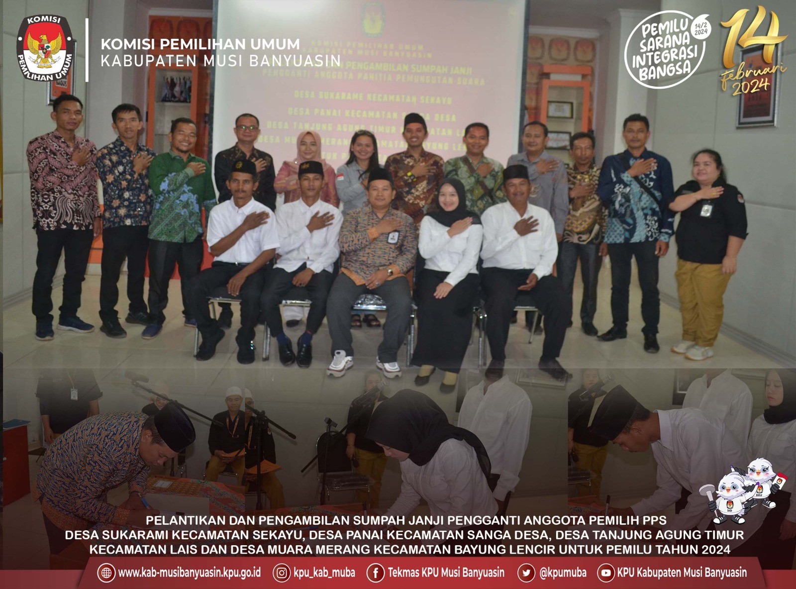 #TemanPemilih, Anggota KPU Kabupaten Musi Banyuasin Divisi Teknis Penyelenggaraan Khoirul Anam pada hari Rabu 12 Juli 2023 secara resmi melakukan Pelantikan dan Pengambilan Sumpah Jabatan kepada PAW PPS Desa sukarami Kecamatan sekayu, PAW PPS Desa panai Kecamatan sangat desa, PAW PPS Desa Tanjung Agung Timur Kecamatan Lais, PAW PPS Desa Merang Kecamatan Bayung Lencir bertempat di ruang pertemuan KPU Kabupaten Musi Banyuasin.
