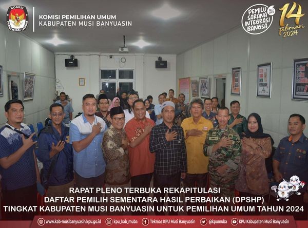 #TemanPemilih, KPU Kabupaten Musi Banyuasin Mengadakan Rapat Pleno Terbuka Rekapitulasi Daftar Pemilih Sementara Hasil Perbaikan (DPSHP) Tingkat Kabupaten Musi Banyuasin Pemilihan Umum Tahun 2024 Acara dilaksanakan pada tanggal 12 Mei 2023 pada pukul 14.00 WIB s.d selesai bertempat di Ruang Rapat kantor KPU Musi Banyuasin. Turut hadir dalam kegiatan Rapat Pleno Ketua dan Anggota KPU Kabupaten Musi Banyuasin, Sekretaris didampingi Kasubbag Perencanaan, data dan informasi, Sekretariat KPU, Panitia Pemilihan Kecamatan (PPK) se-Kabupaten Musi Banyuasin, Bawaslu, Instansi terkait dan Partai Politik. #KPUMelayani #PemiluSerentak2024 ------------------------------------ Find Us On: Facebook: Tekmas KPU Musi Banyuasin Instagram: kpu_kab_muba Youtube: KPU Kabupaten Musi Banyuasin Twitter: @kpumuba Website: www.kab-musibanyuasin.kpu.go.id Alamat: Jl. Sekayu - Muara Teladan RT. 035 RW. 010 Kelurahan Balai Agung Kec. Sekayu - Musi Banyuasin.