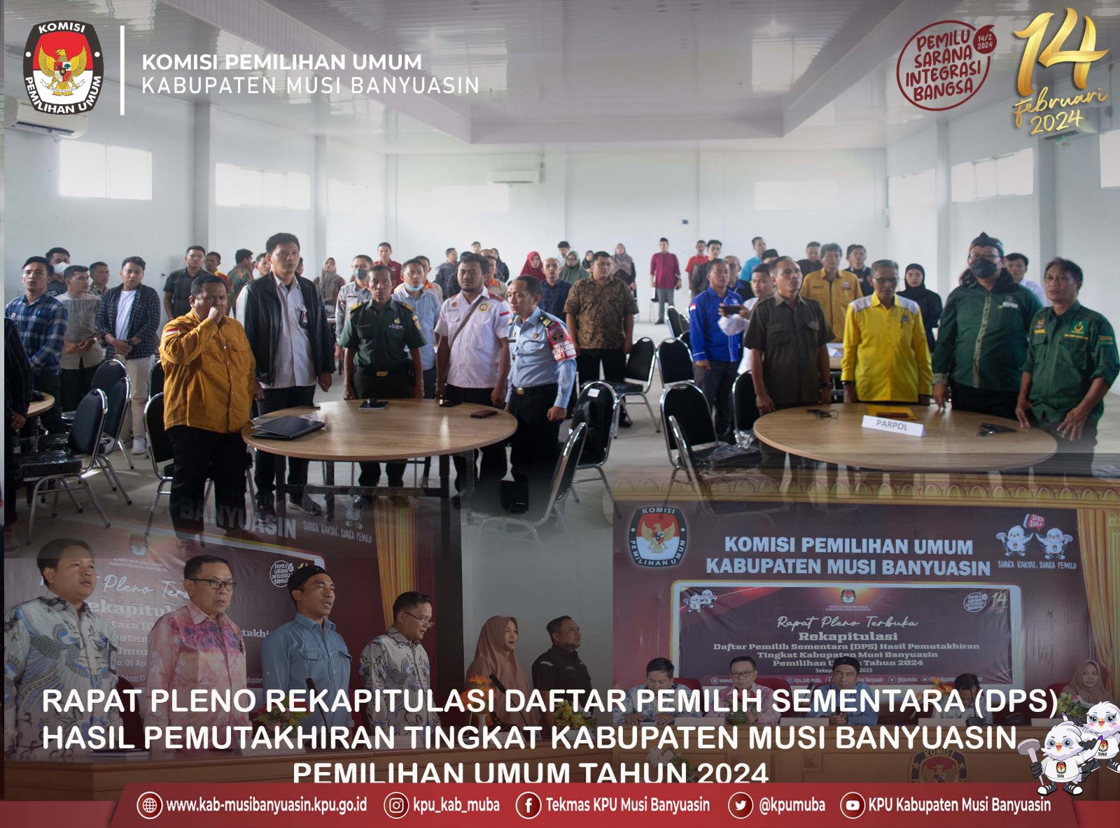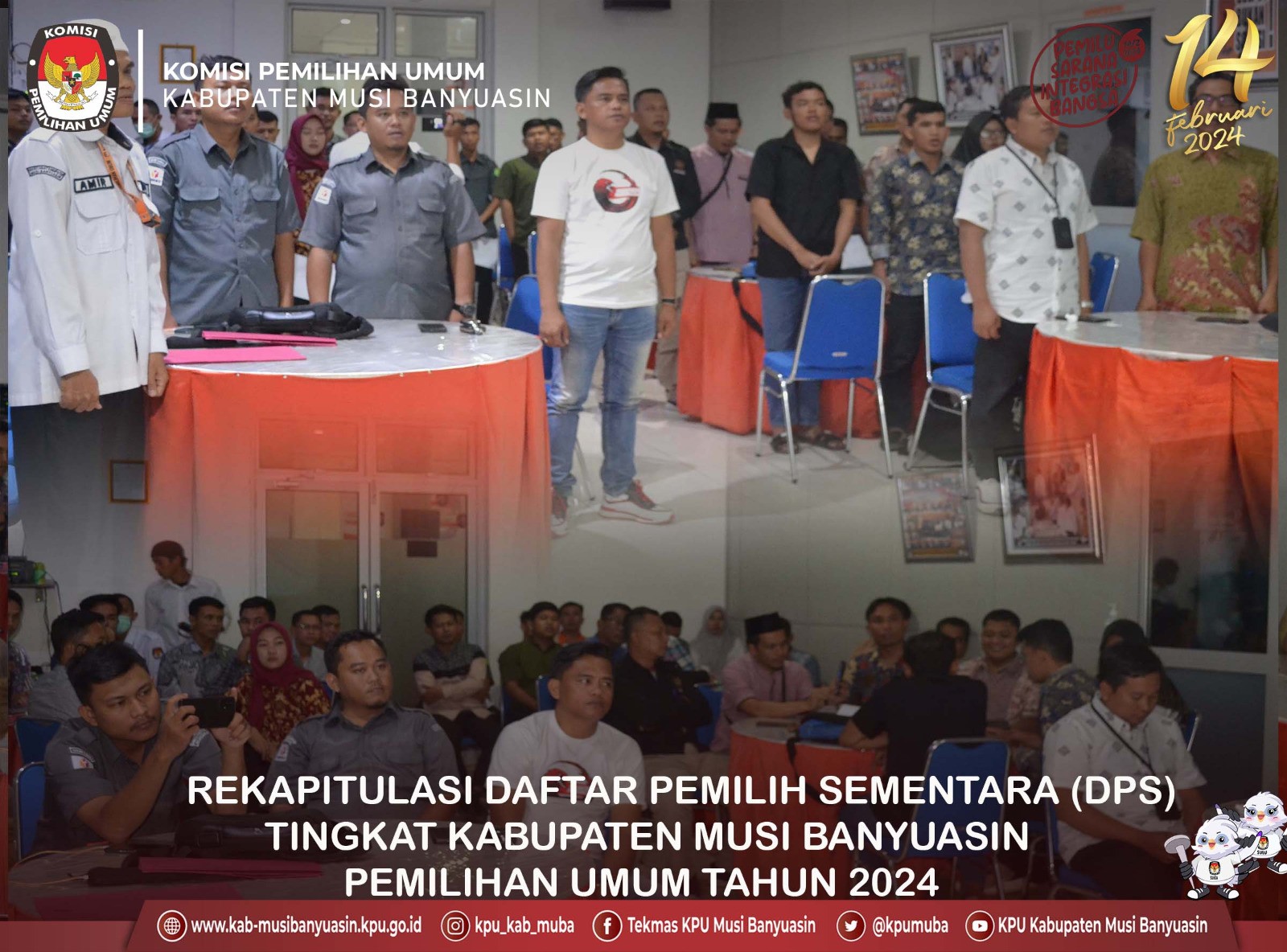 #TemanPemilih, KPU Kabupaten Musi Banyuasin Melaksanakan Rapat Pleno Terbuka Rekapitulasi Daftar Pemilih Sementara Hasil Pemutakhiran dan Penetapan Daftar Pemilih Sementara (DPS) Tingkat Kabupaten Musi Banyuasin pada Pemilihan Pemilihan Umum Tahun 2024, acara yang di hadiri oleh stakeholder terkait, Partai politik peserta pemilu tahun 2024, Bawaslu Kab.MUBA, dan anggota Divisi Data dan Operator Sidalih Panitia Pemilihan kecamatan (PPK). Rapat tersebut di buka langsung oleh ketua KPU Kab. Musi Banyuasin (Yupizer) di dampingi anggota KPU Musi Banyuasin ( Amril Nurman) Divisi Perencanaan data dan Informasi, (Khoirul Anam) Divisi Teknis Penyelenggaraan, dan (Maryani) Divisi Sosialisasi Pendidikan, partisipasi masyrakat dan SDM, Divisi Hukum dan Pengawasan serta Sekretaris di Aula KPU Kabupaten Musi Banyuasin.