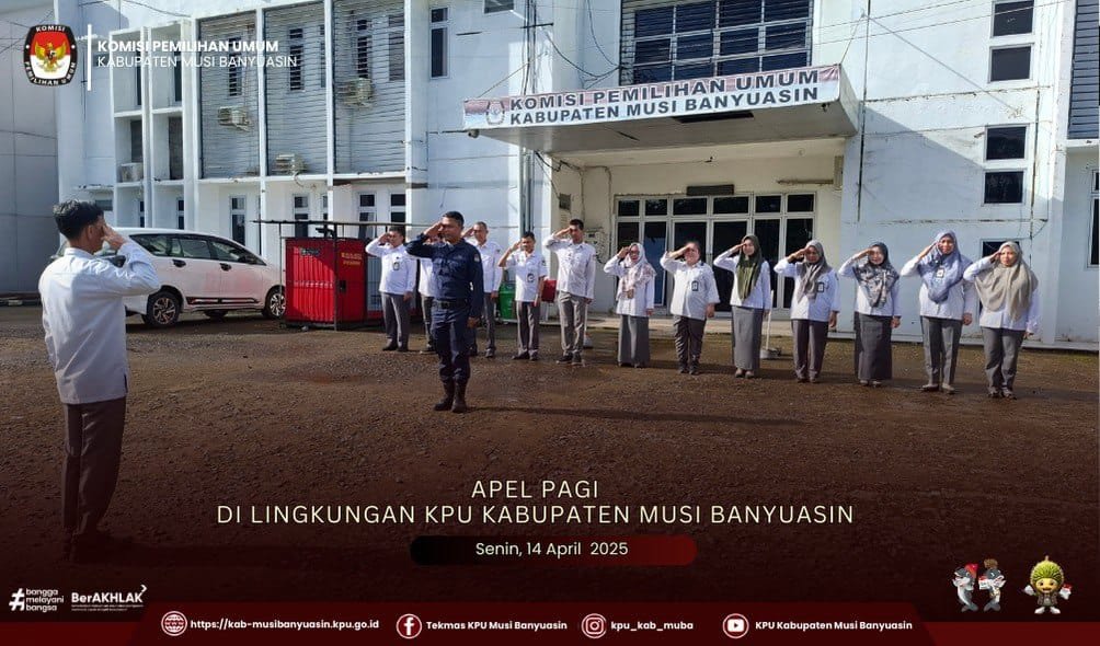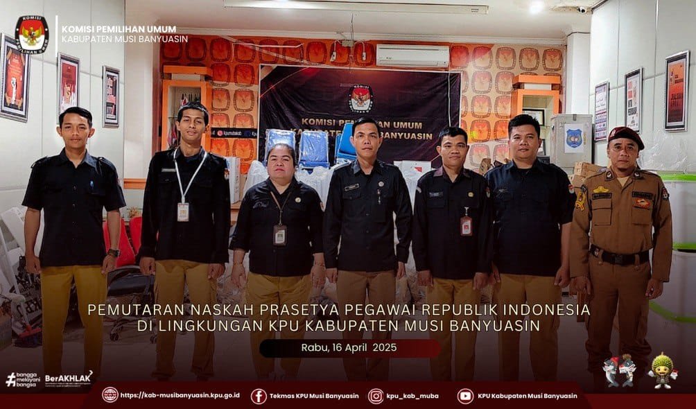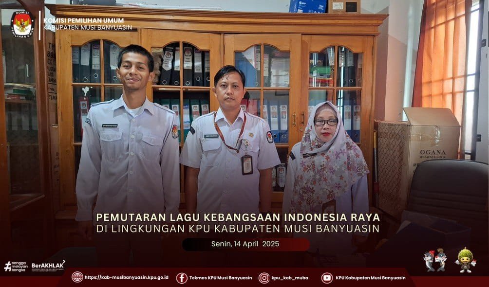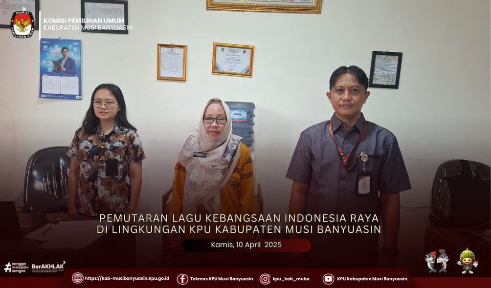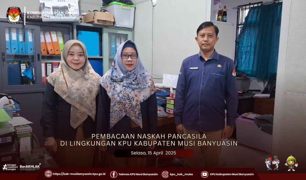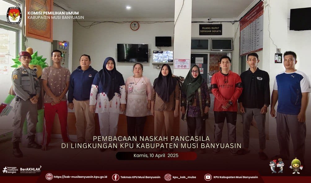 Kementeriaan Sekretariat Negara Republik Indonesia Nomor: B-32/KSN/TU.00/01/2025 dan Surat KPU Republik Indonesia Nomor: 350/PK.02-SD/03/2025 Perihal Pemberitahuan Untuk Mendengarkan Lagu Kebangsaan Indonesia Raya dan Naskah lainnya, Komisioner dan Sekretariat KPU Kabupaten Musi Banyuasin melakukan pembacaan naskah Pancasila di Kantor KPU Kabupaten Musi Banyuasin.
