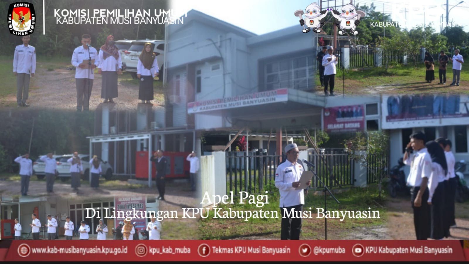 Pelaksanaan Apel rutin di halaman Kantor KPU Kabupaten Musi Banyuasin pada pukul 08.00 WIB dimulai dengan mendengarkan lagu Indonesia Raya, pembacaan UUD 1945, pembacaan Naskah Pancasila serta pembacaan Panca Prasetya KORPRI ditutup dengan Pembacaan Doa.