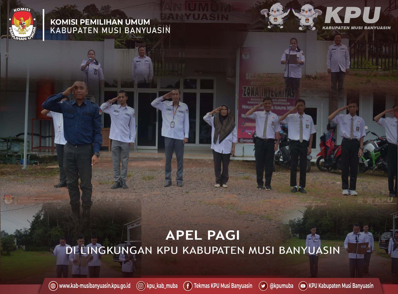 Pelaksanaan Apel rutin di halaman Kantor KPU Kabupaten Musi Banyuasin pada pukul 08.00 WIB dimulai dengan mendengarkan lagu Indonesia Raya, pembacaan UUD 1945, pembacaan Naskah Pancasila serta pembacaan Panca Prasetya KORPRI ditutup dengan Pembacaan Doa.