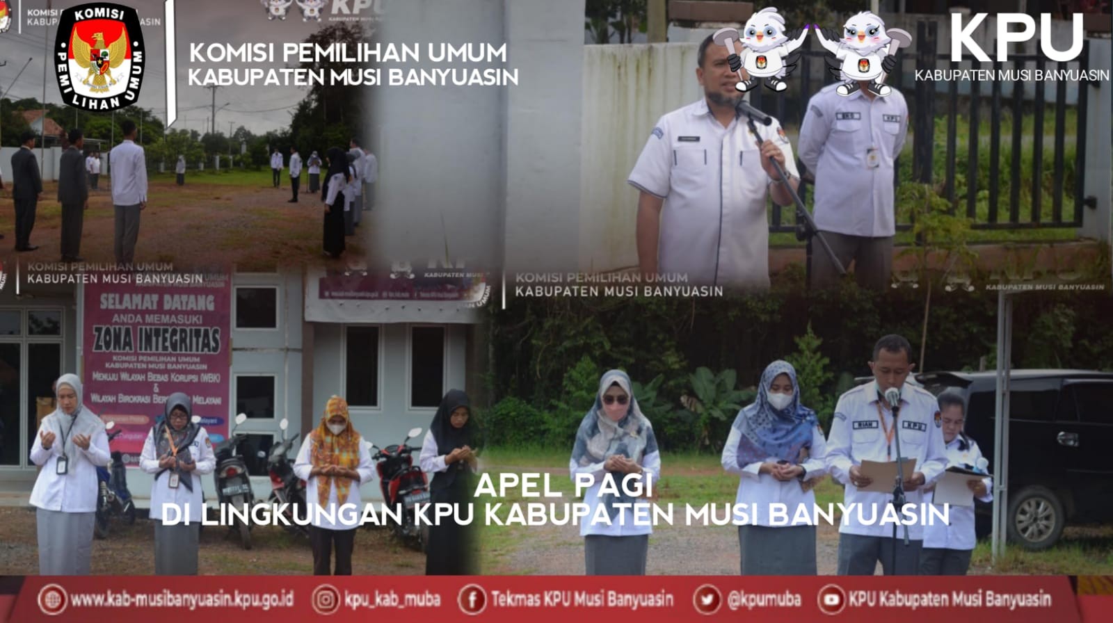 Pelaksanaan Apel rutin di halaman Kantor KPU Kabupaten Musi Banyuasin pada pukul 08.00 WIB dimulai dengan mendengarkan lagu Indonesia Raya, pembacaan UUD 1945, pembacaan Naskah Pancasila serta pembacaan Panca Prasetya KORPRI ditutup dengan Pembacaan Doa.