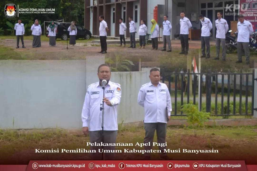 Pelaksanaan Apel rutin di halaman Kantor KPU Kabupaten Musi Banyuasin pada pukul 08.00 WIB dimulai dengan mendengarkan lagu Indonesia Raya, pembacaan UUD 1945, pembacaan Naskah Pancasila serta pembacaan Panca Prasetya KORPRI ditutup dengan Pembacaan Doa.
