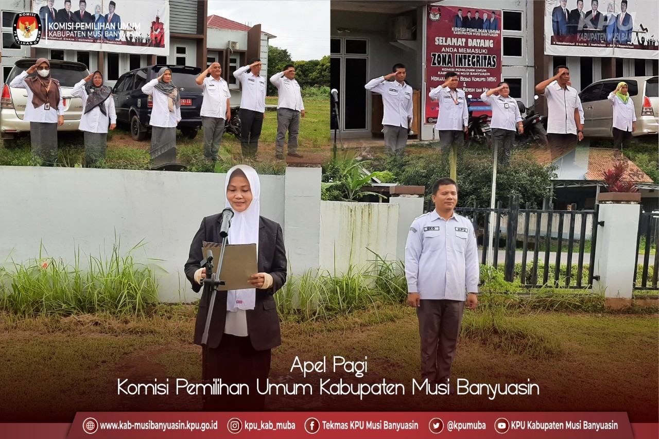 Pelaksanaan Apel rutin di halaman Kantor KPU Kabupaten Musi Banyuasin pada pukul 08.00 WIB dimulai dengan mendengarkan lagu Indonesia Raya, pembacaan UUD 1945, pembacaan Naskah Pancasila serta pembacaan Panca Prasetya KORPRI ditutup dengan Pembacaan Doa.