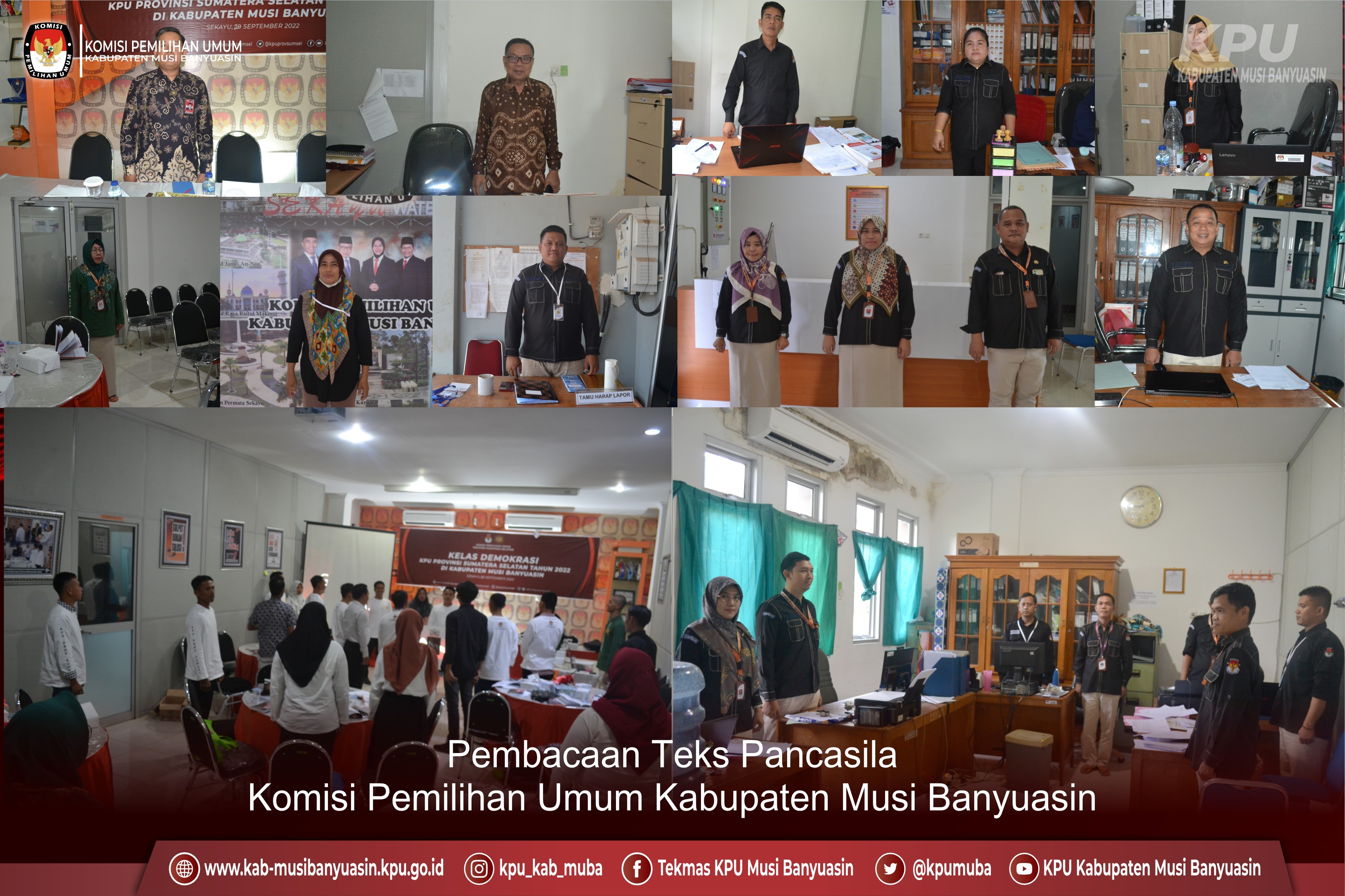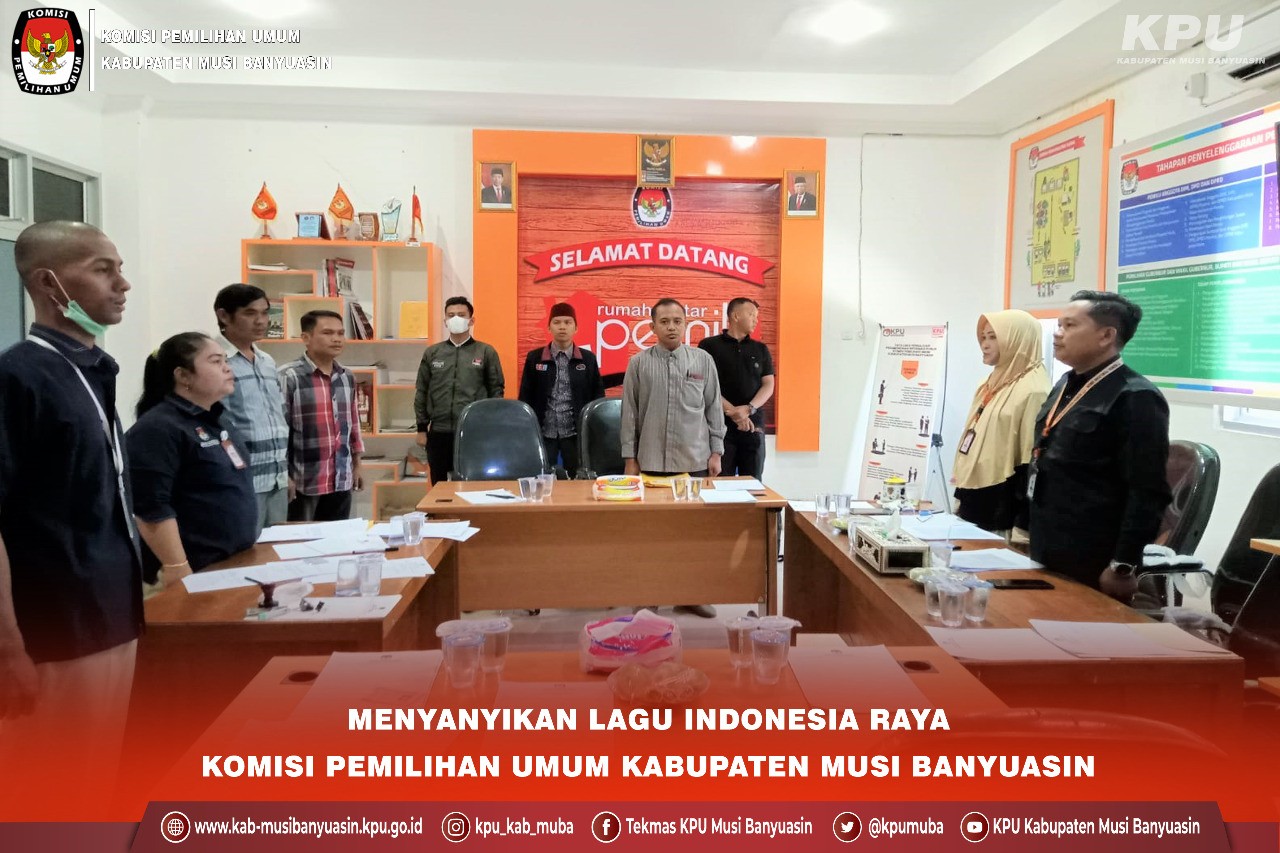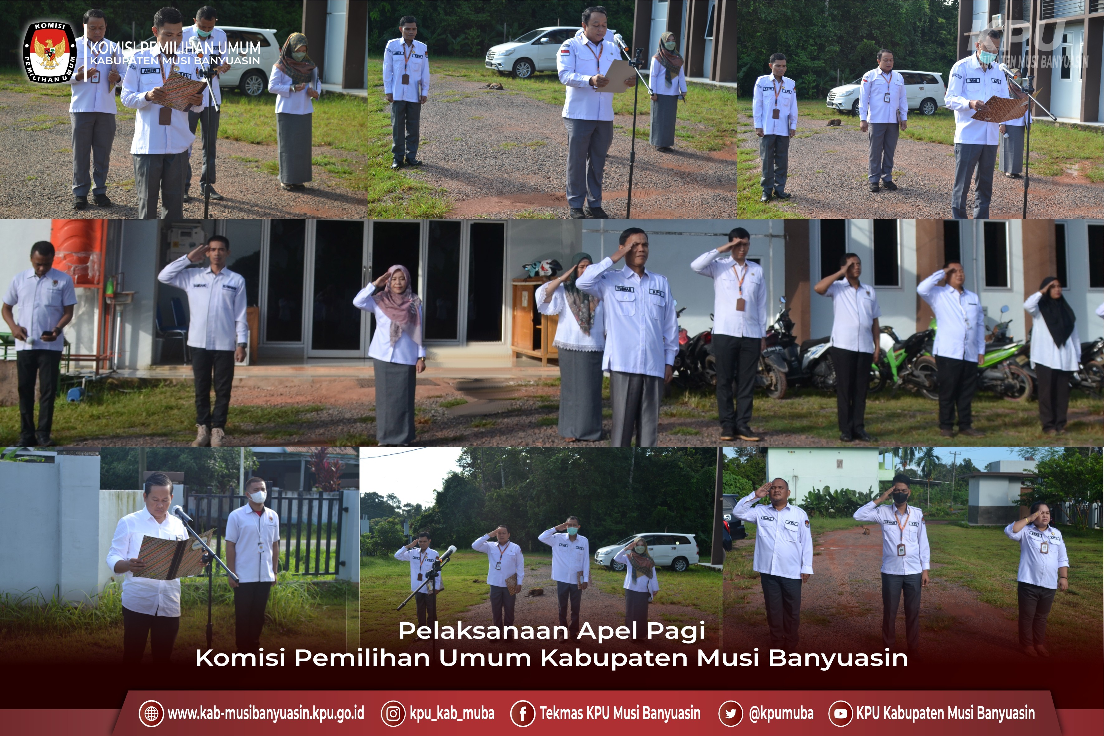 Pelaksanaan Apel rutin di halaman Kantor KPU Kabupaten Musi Banyuasin pada pukul 08.00 WIB dimulai dengan mendengarkan lagu Indonesia Raya, pembacaan UUD 1945, pembacaan Naskah Pancasila serta pembacaan Panca Prasetya KORPRI ditutup dengan Pembacaan Doa.
