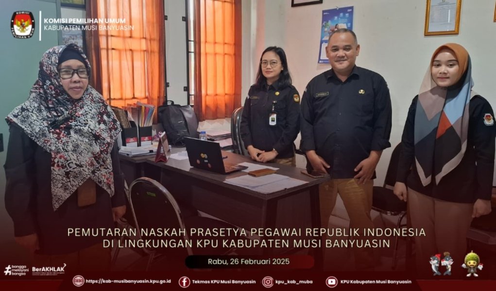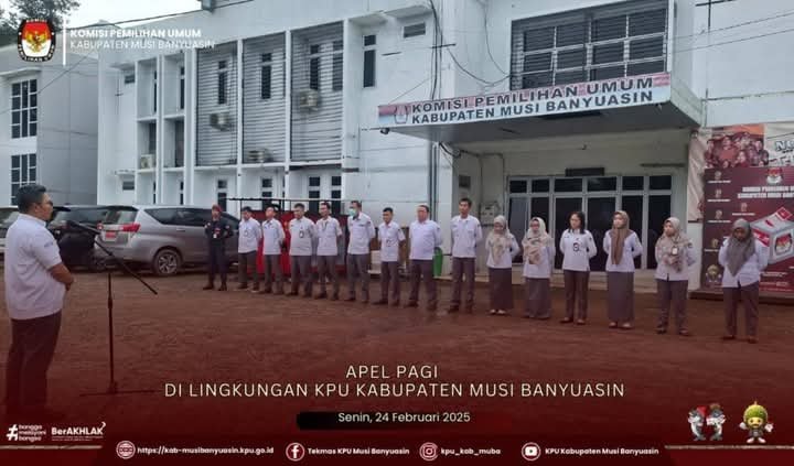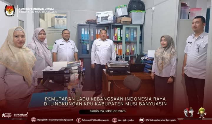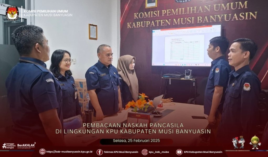 Kementeriaan Sekretariat Negara Republik Indonesia Nomor: B-32/KSN/TU.00/01/2025 dan Surat KPU Republik Indonesia Nomor: 350/PK.02-SD/03/2025 Perihal Pemberitahuan Untuk Mendengarkan Lagu Kebangsaan Indonesia Raya dan Naskah lainnya, Komisioner dan Sekretariat KPU Kabupaten Musi Banyuasin melakukan pembacaan naskah Pancasila di Kantor KPU Kabupaten Musi Banyuasin.