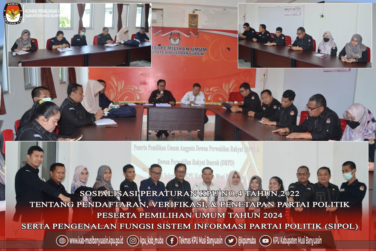 #TemanPemilih, KPU Kabupaten Musi Banyuasin melaksanakan Sosialisasi Hasil Bimtek Peraturan KPU No 4 Tahun 2022 tentang Pendaftaran, Verifikasi, dan Penetapan Partai Politik Peserta Pemilihan Umum Tahun 2024 serta Pengenalan Fungsi Sistem Informasi Partai Politik, Kegiatan ini berlangsung di Ruang Rapat Kuyung Kupek di KPU Kabupaten Musi Banyuasin.