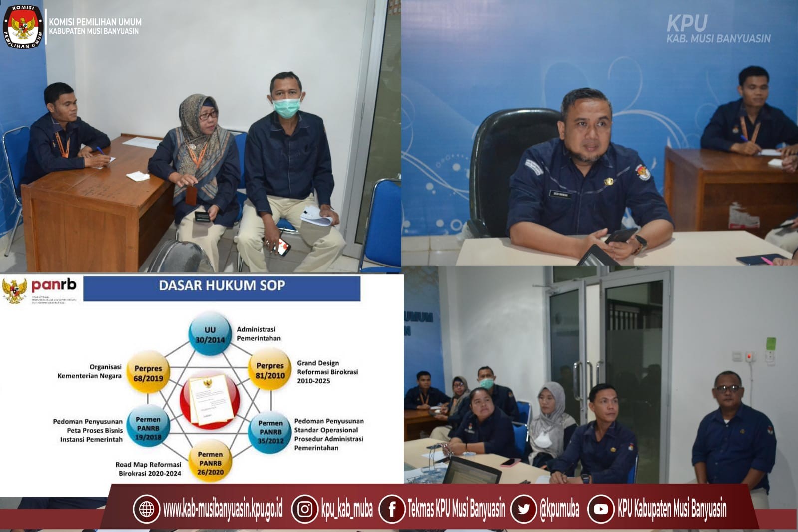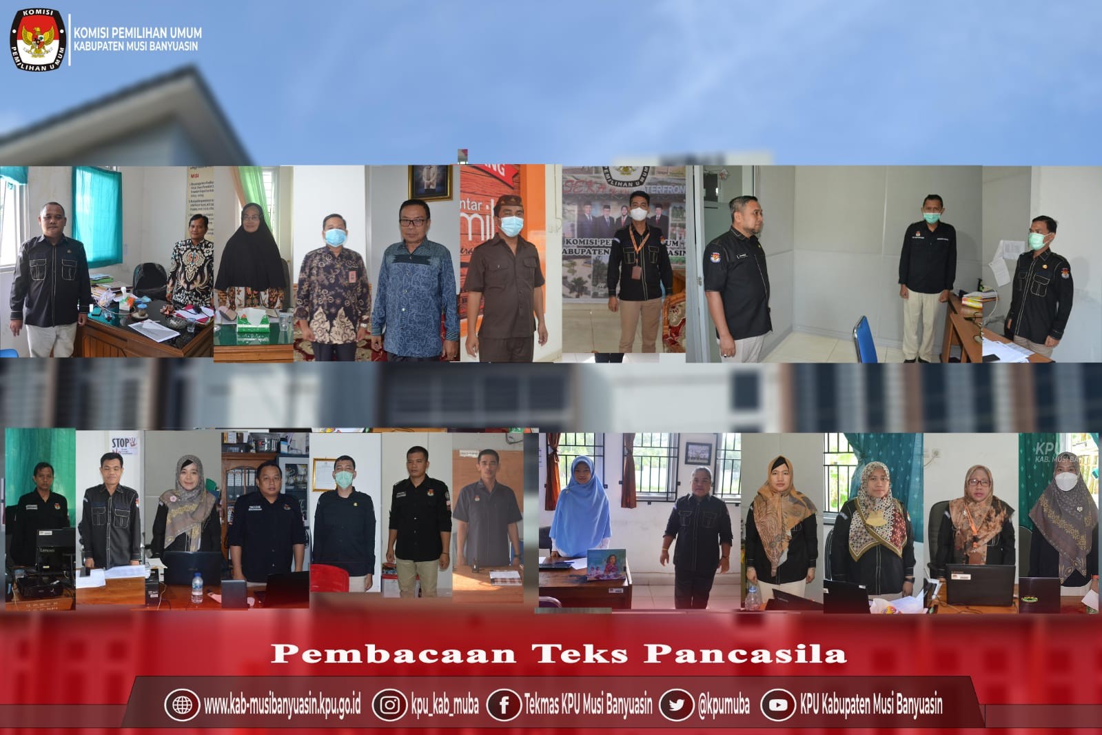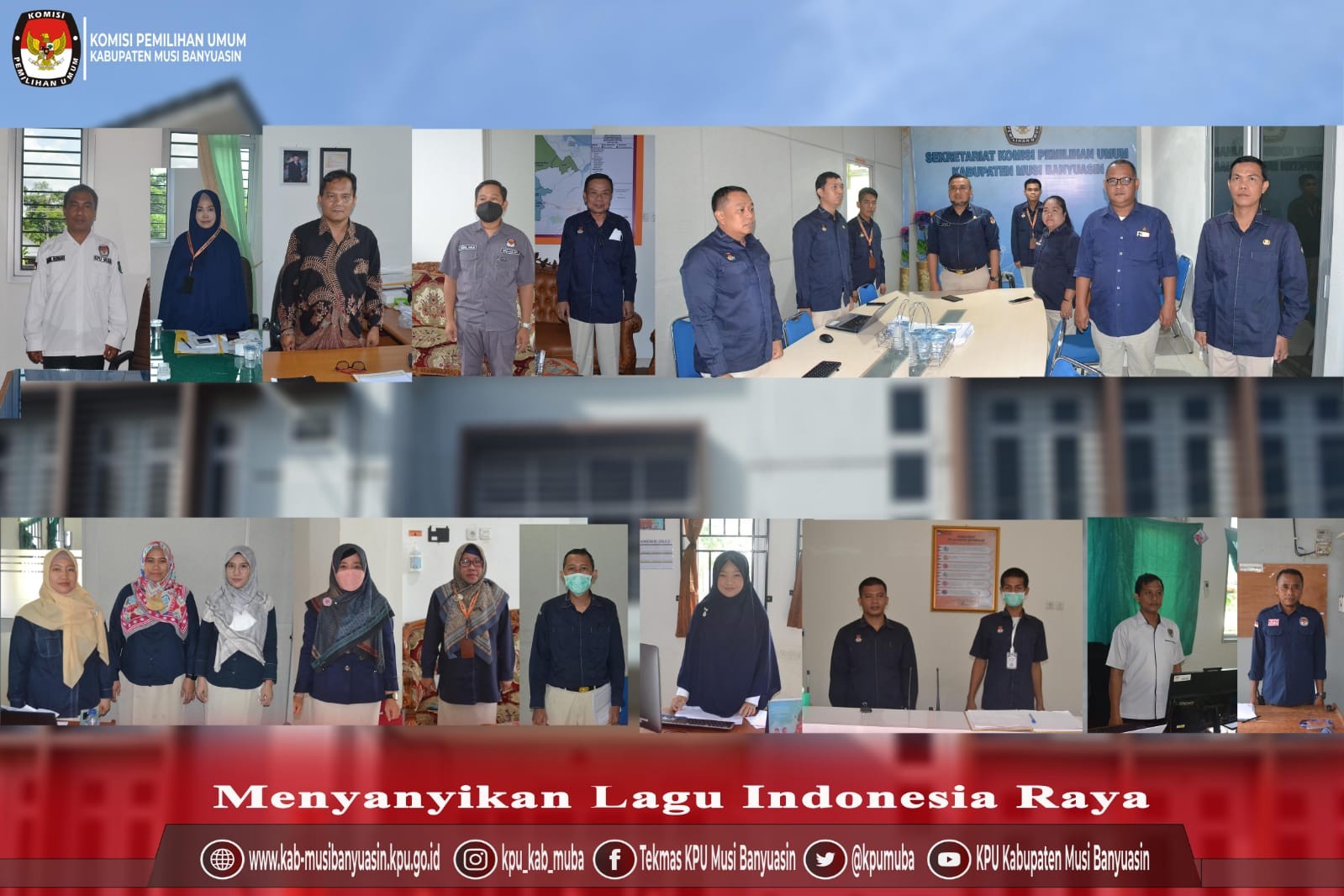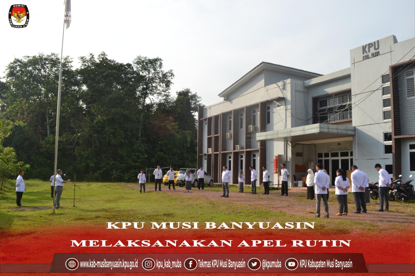 Pelaksanaan Apel rutin di halaman Kantor KPU Kabupaten Musi Banyuasin dimulai dengan mendengarkan lagu Indonesia Raya, pembacaan UUD 1945, pembacaan Naskah Pancasila serta pembacaan Panca Prasetya KORPRI ditutup dengan Pembacaan Doa.