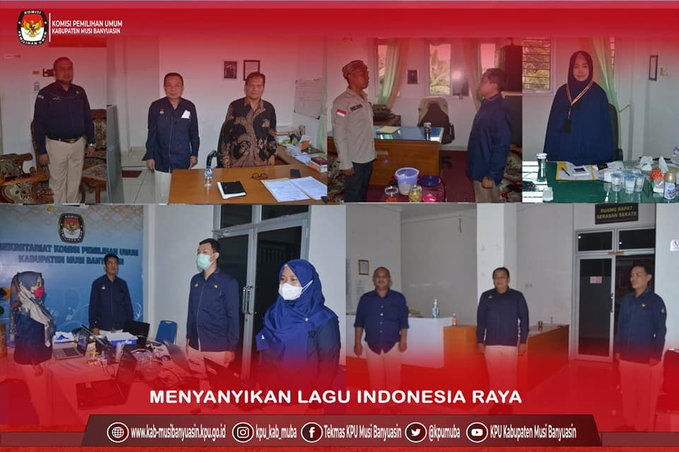 Pelaksanaan Apel rutin di halaman Kantor KPU Kabupaten Musi Banyuasin dimulai dengan mendengarkan lagu Indonesia Raya, pembacaan UUD 1945, pembacaan Naskah Pancasila serta pembacaan Panca Prasetya KORPRI ditutup dengan Pembacaan Doa.
