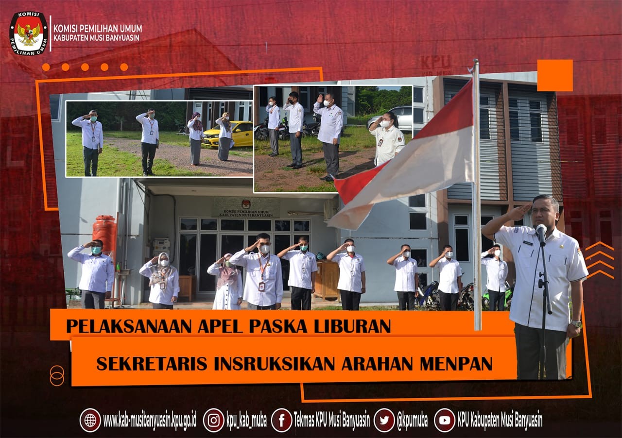 #TemanPemilih, Pelaksanaan Apel pertama paska liburan hari lebaran dilaksanakan di halaman Kantor Komisi Pemilhan Umum Kabupaten Musi Banyuasin. "Sesuai Surat dari KPU Republik Indonesia Nomor 978/SDM.03.5-SD. Perihal : Pelaksanaan Pemberlakuan Sistem Kerja WFO dan WFH Pasca Cuti Bersama Hari Raya Idul Fitri 1443 H, dalam rangka pencegahan dan mengantisipasi penyebaran covid-19 serta sesuai dengan himbauan Menteri Pendayagunaan Aparatur Negara dan Reformasi Demokrasi ujar pembina Apel, Dedi Irawan, S.I.P, M.S.i