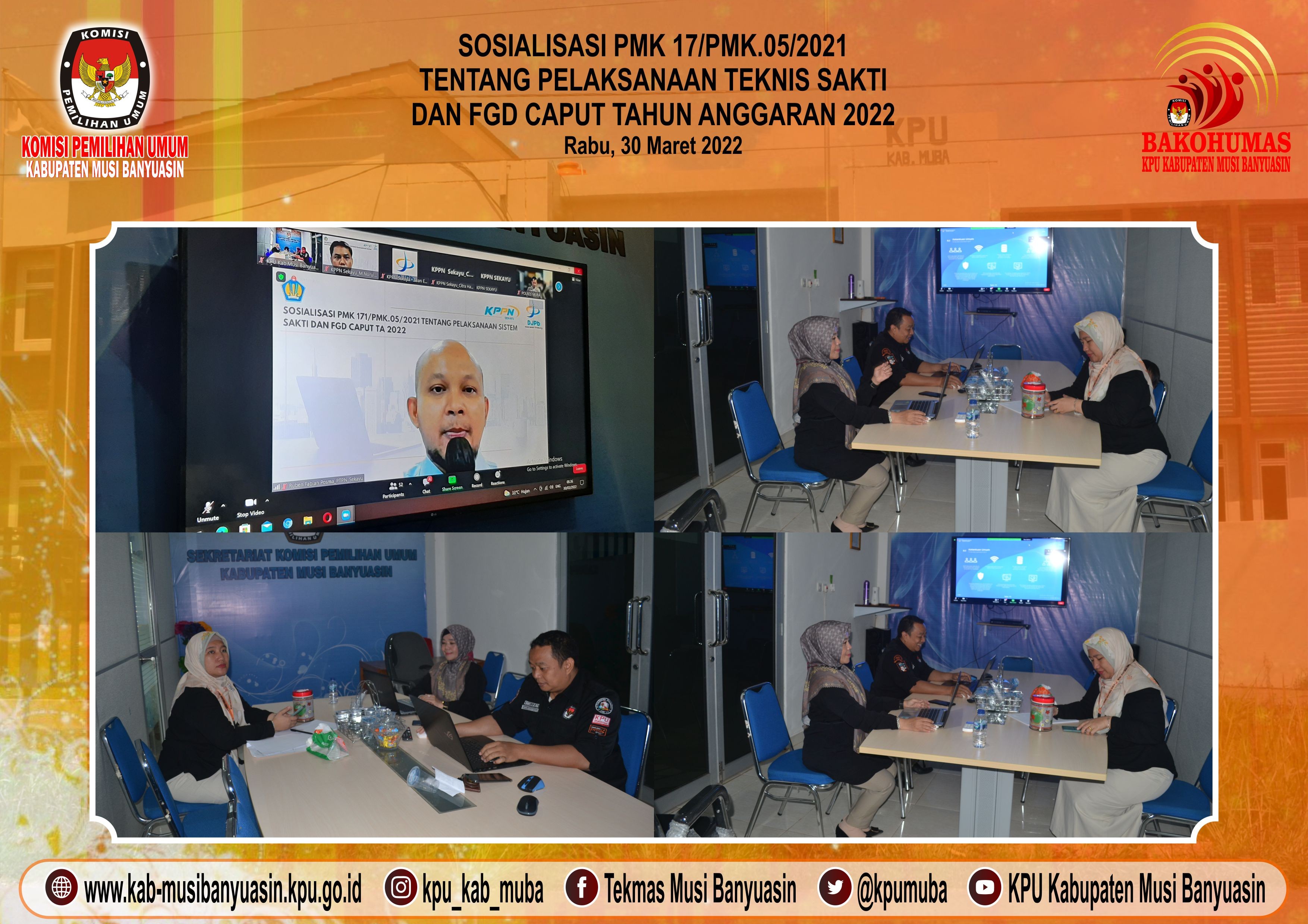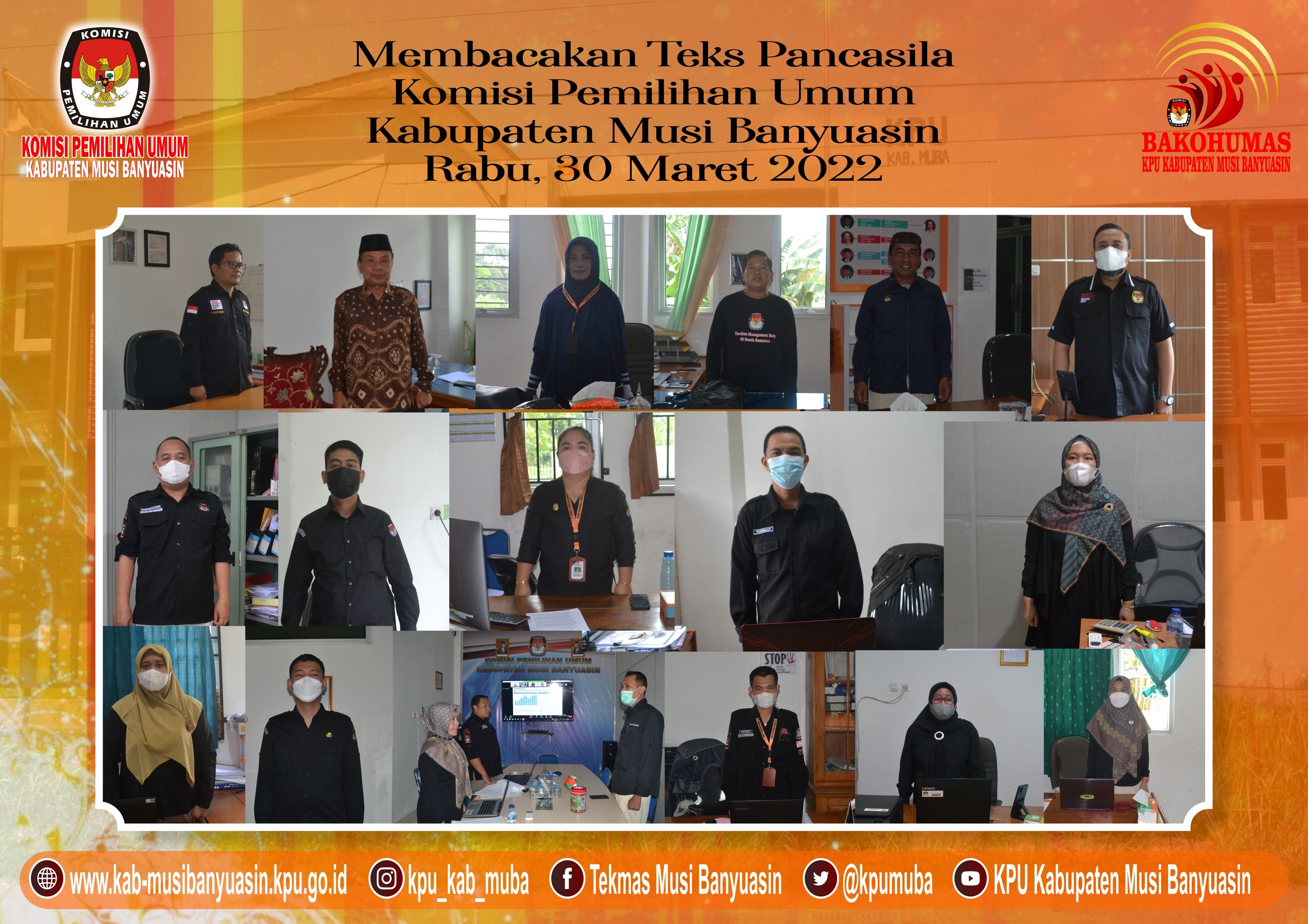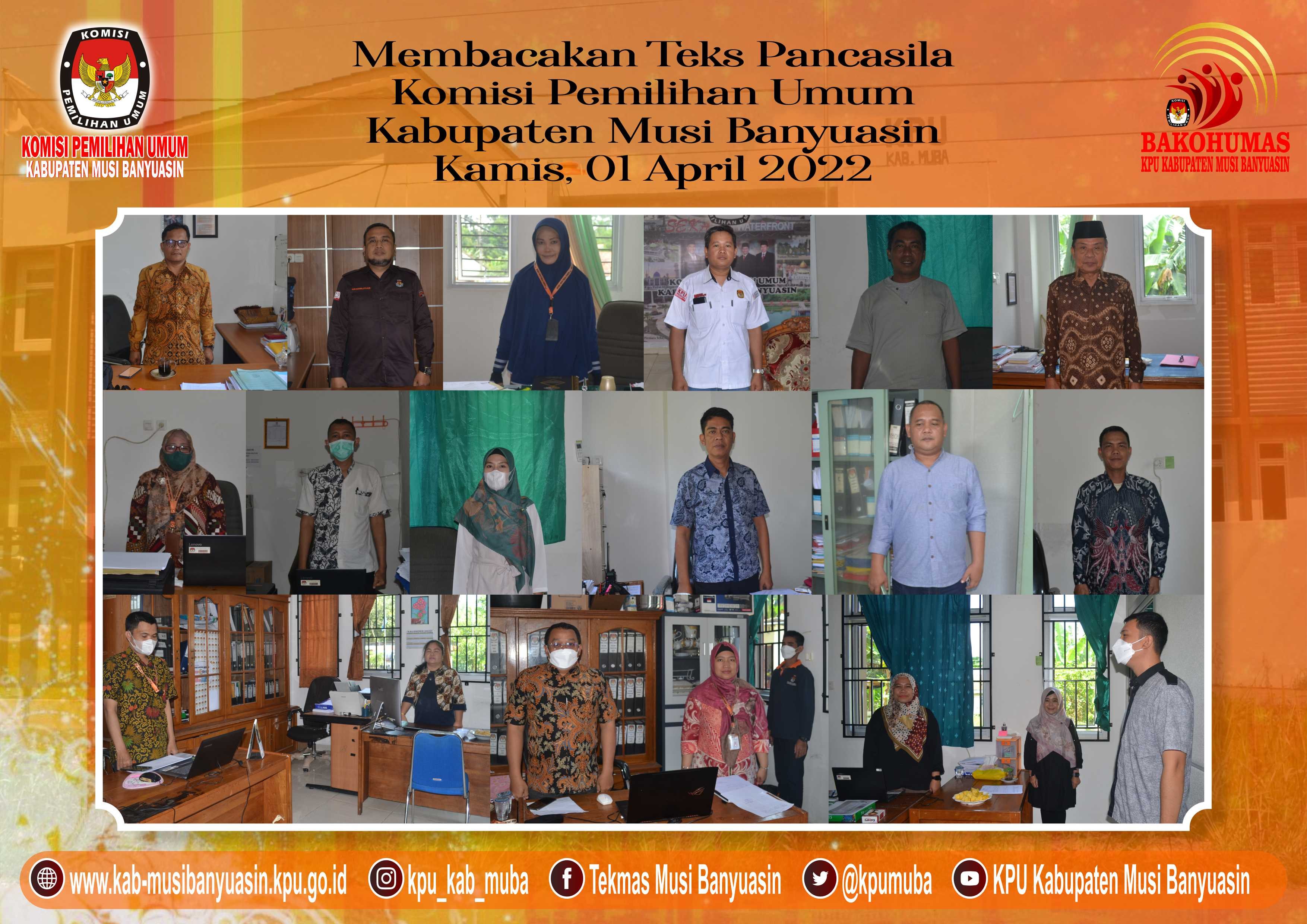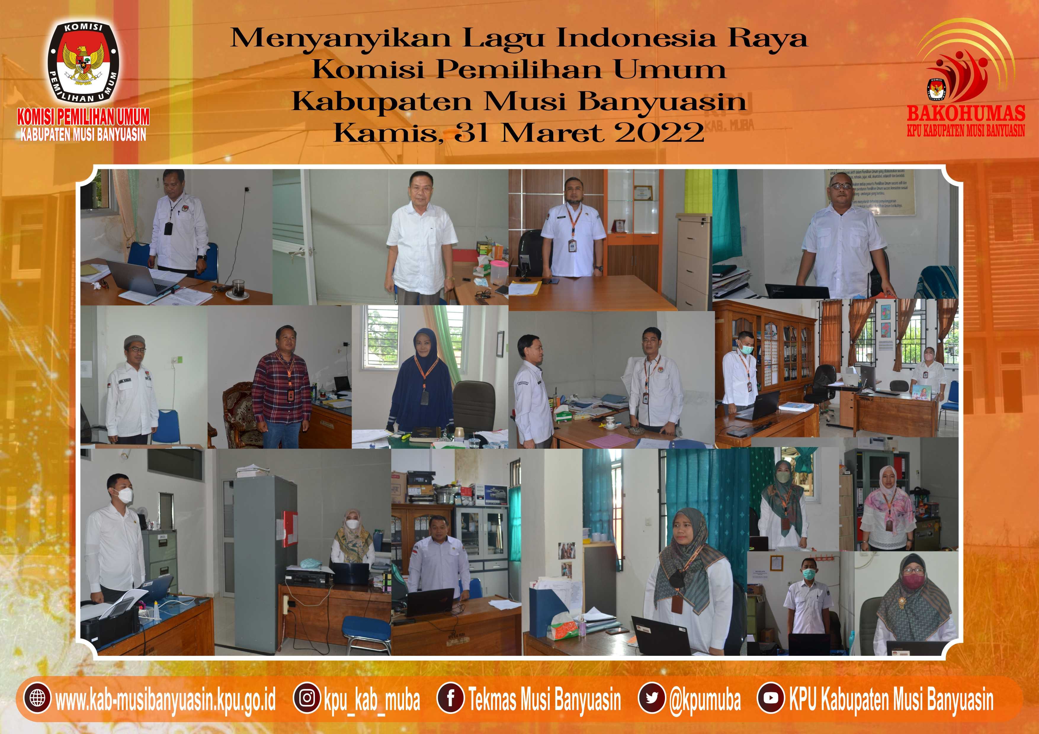 #TemanPemilih, Dalam rangka memelihara dan meningkatkan rasa kebangsaan dan cinta tanah air, pengabdian terhadap negara dan rakyat indonesia serta ketaatan terhadap ideologi Pancasila dan Undang-Undang Dasar Republik Indonesia Tahun 1945, KPU Kabupaten Musi Banyuasin melaksanakan kegiatan mendengarkan Lagu Kebangsaan Indonesia Raya pada hari Selasa dan Kamis di setiap minggu pada pukul 10.00 Pagi, Kamis, (31/3/22).