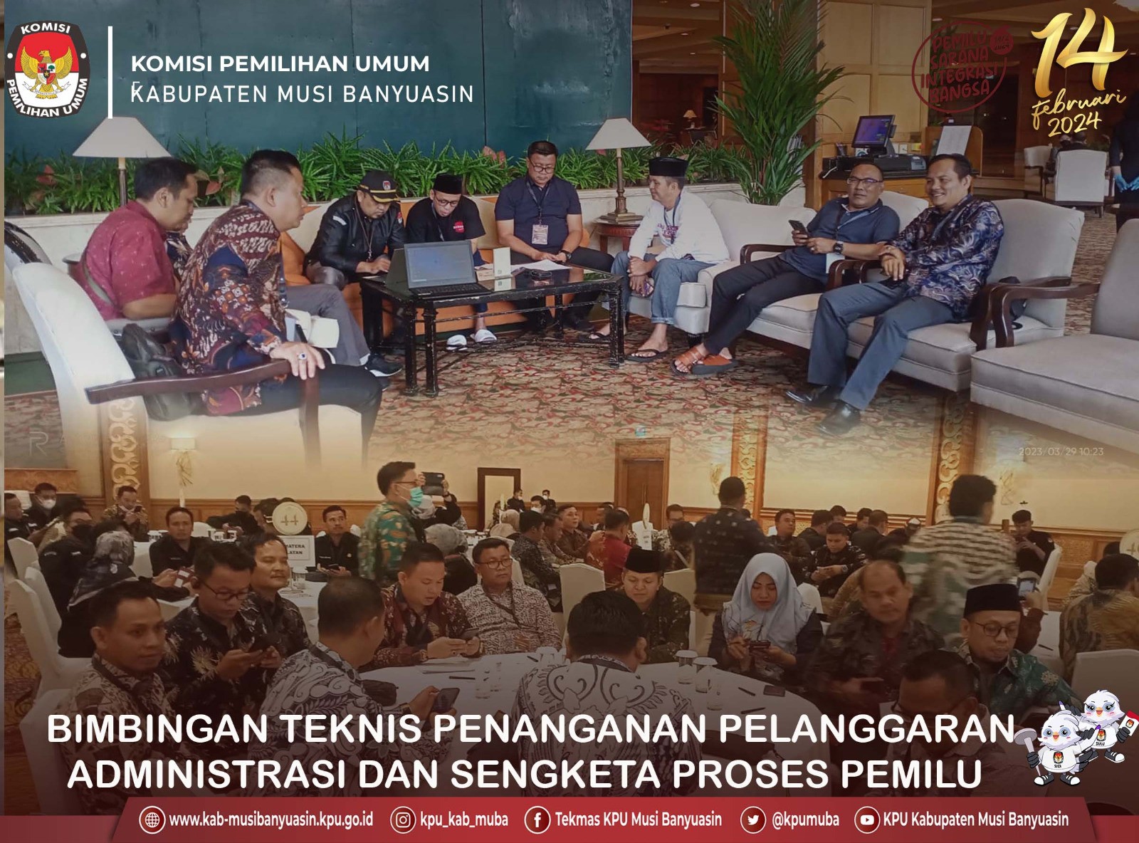 #TemanPemilih, Ketua KPU Kabupaten Musi Banyuasin (Yupizer) dan Kasubbag Hukum dan SDM KPU Musi Banyuasin ( Vera Tri Agustina) menghadiri kegiatan Bimbingan Teknis Penanganan Pelanggaran Administrasi dan Sengketa Proses Pemilihan Umum Tahun 2024 yang di selenggarakan oleh KPU Republik Indonesia yang dihadiri oleh KPU Provinsi/KIP Aceh dan KPU/KIP Kabupaten/Kota di seluruh Indonesia. (30/3/2023). Untuk Bimtek Gelombang I dilaksanakan pada hari rabu s.d jumat, tanggal 29 s.d 31 Maret 2023, di hotel Shangri-La, kota surabaya, jawa timur. Kegiatan tersebut di hadiri oleh 1 orang Anggota yang membidangi divisi hukum dan 1 Kepala Bagian atau kepala sub bagian hukum dari masing-masing KPU Provinsi dan KPU Kabupaten /Kot. Dengan jumlah peserta yang hadir sebanyak 32 orang peserta dari 16 KPU Provinsi dan 514 orang peserta dari KPU Kabupaten / kota. #KPUMelayani #PemiluSerentak2024 --------------------- Find Us On: Facebook: Tekmas KPU Musi Banyuasin Instagram: kpu_kab_muba Youtube: KPU Kabupaten Musi Banyuasin Twitter: @kpumuba