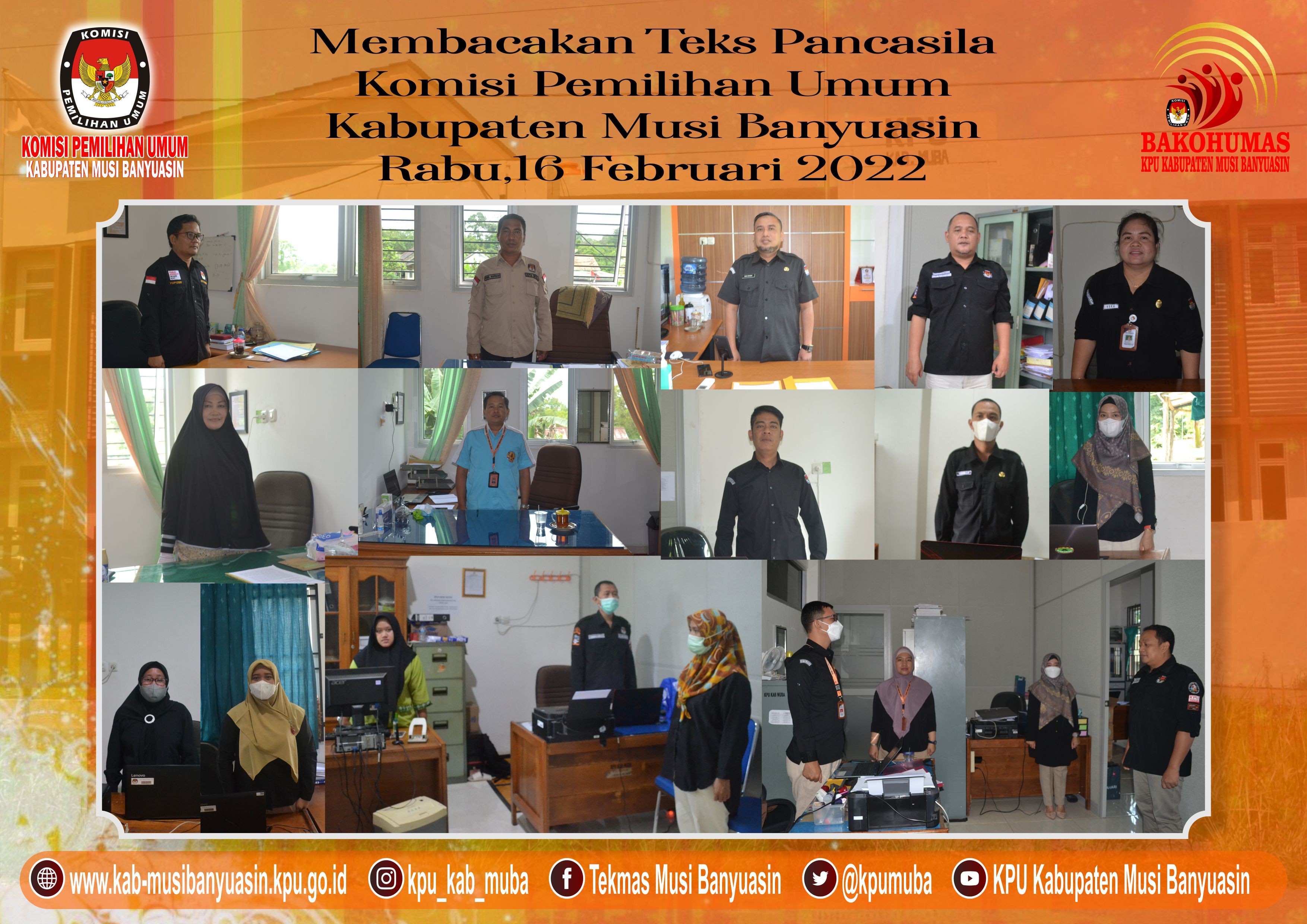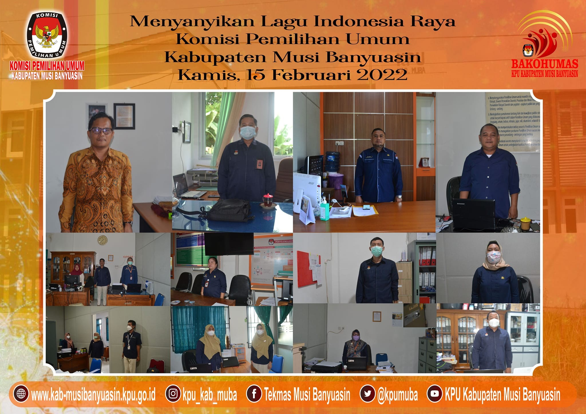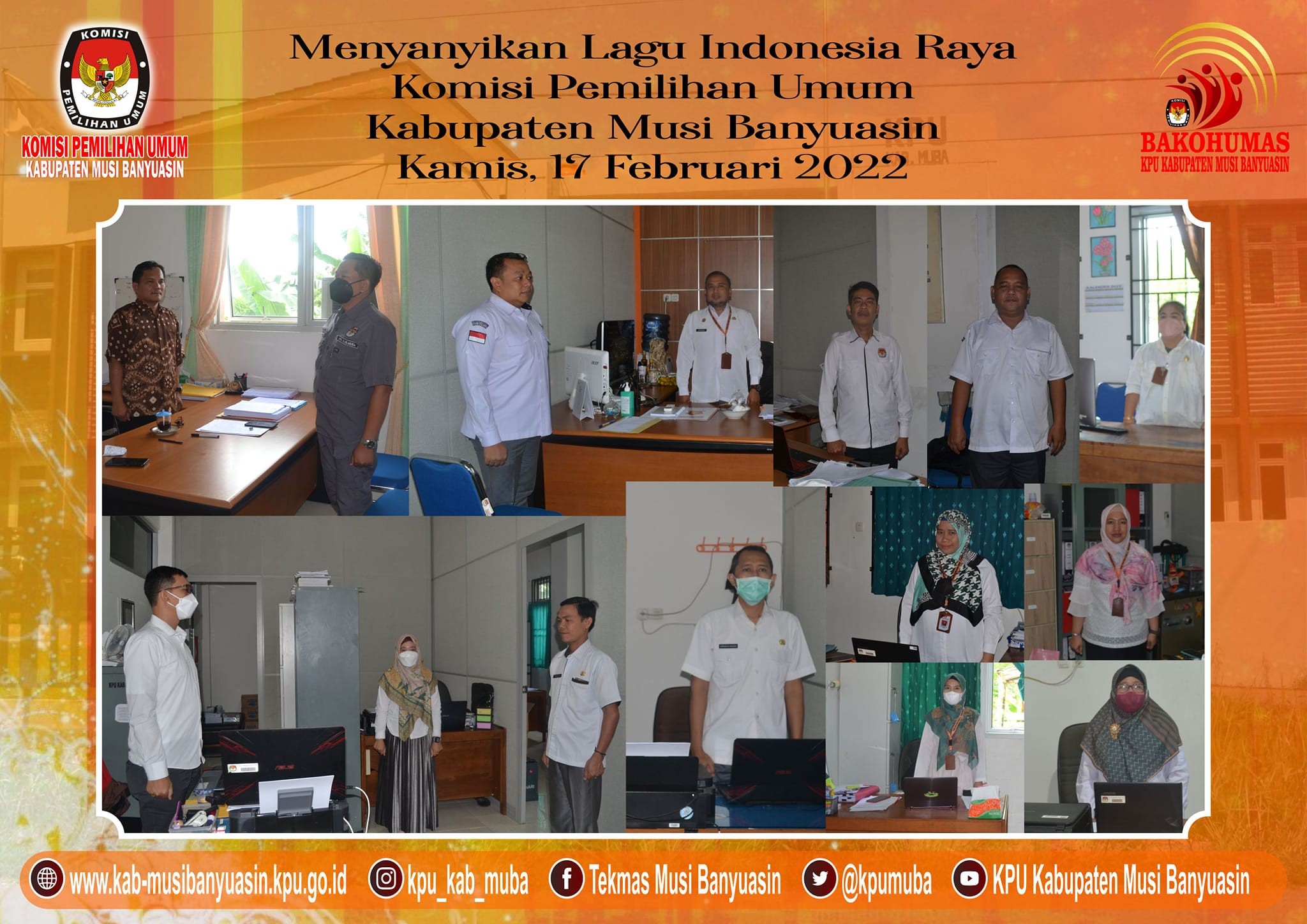 #TemanPemilih, Dalam rangka memelihara dan meningkatkan rasa kebangsaan dan cinta tanah air, pengabdian terhadap negara dan rakyat indonesia serta ketaatan terhadap ideologi Pancasila dan Undang-Undang Dasar Republik Indonesia Tahun 1945, KPU Kabupaten Musi Banyuasin melaksanakan kegiatan mendengarkan Lagu Kebangsaan Indonesia Raya pada hari Selasa dan Kamis di setiap minggu pada pukul 10.00 Pagi, Selasa, (15/2/22).