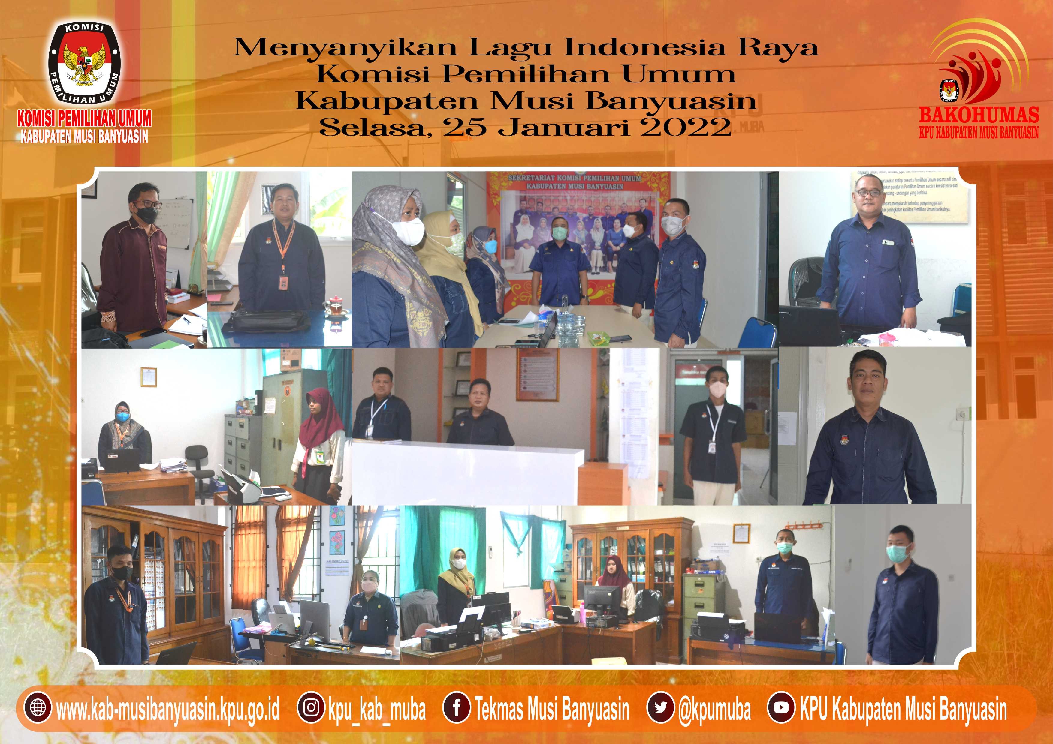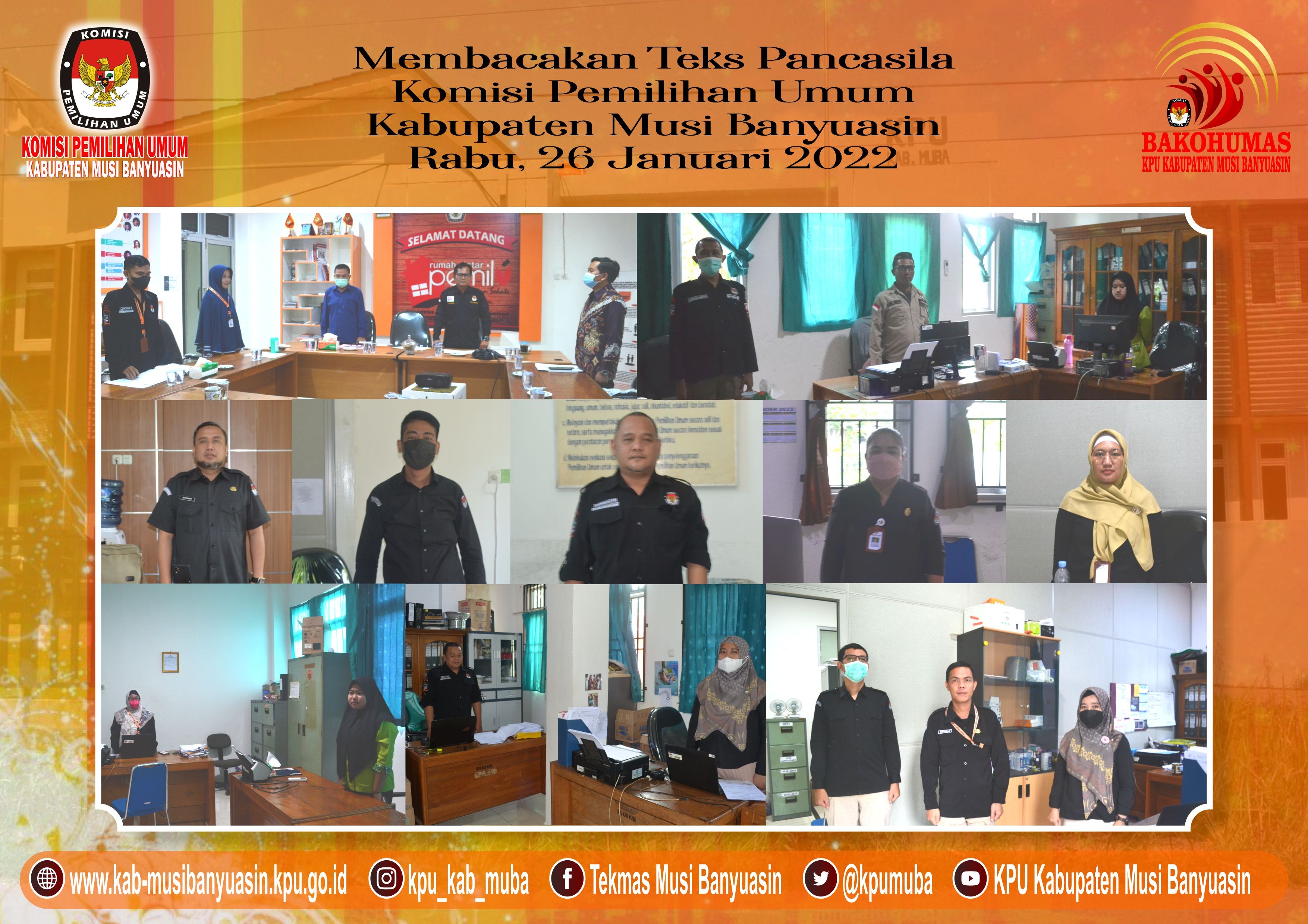 #TemanPemilih, Dalam rangka memelihara dan meningkatkan rasa kebangsaan dan cinta tanah air, pengabdian terhadap negara dan rakyat indonesia serta ketaatan terhadap ideologi Pancasila dan Undang-Undang Dasar Republik Indonesia Tahun 1945, KPU Kabupaten Musi Banyuasin melaksanakan kegiatan Membacakan Teks Pancasila pada hari Rabu dan Jum'at di setiap minggu pada pukul 10.00 Pagi, Jumat, (26/1/2022).