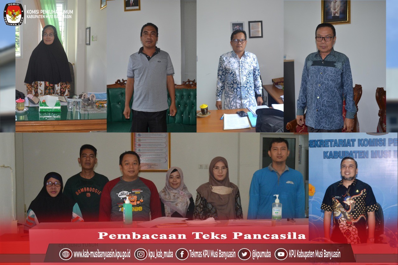 #TemanPemilih, Dalam rangka memelihara dan meningkatkan rasa kebangsaan dan cinta tanah air, pengabdian terhadap negara dan rakyat indonesia serta ketaatan terhadap ideologi Pancasila dan Undang-Undang Dasar Republik Indonesia Tahun 1945, KPU Kabupaten Musi Banyuasin melaksanakan kegiatan Membacakan Teks Pancasila pada hari Rabu dan Jum'at di setiap minggu pada pukul 10.00 Pagi. Jumat, (17/6/22).