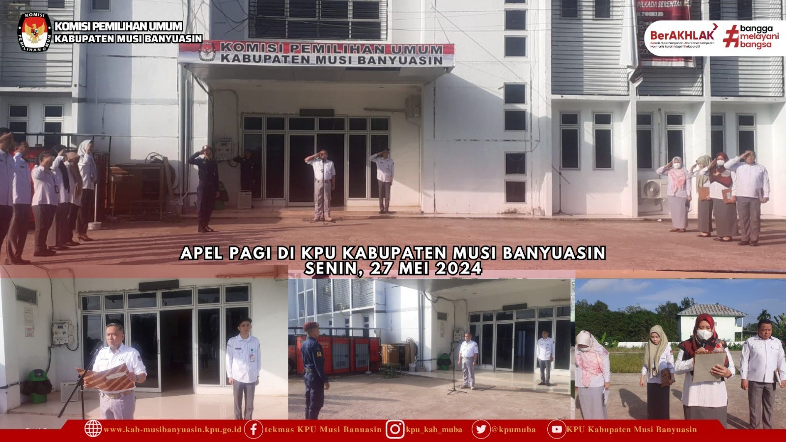 Pelaksanaan Apel rutin di halaman Kantor KPU Kabupaten Musi Banyuasin pada pukul 08.00 WIB dimulai dengan mendengarkan lagu Indonesia Raya, pembacaan UUD 1945, pembacaan Naskah Pancasila serta pembacaan Panca Prasetya KORPRI ditutup dengan Pembacaan Doa.