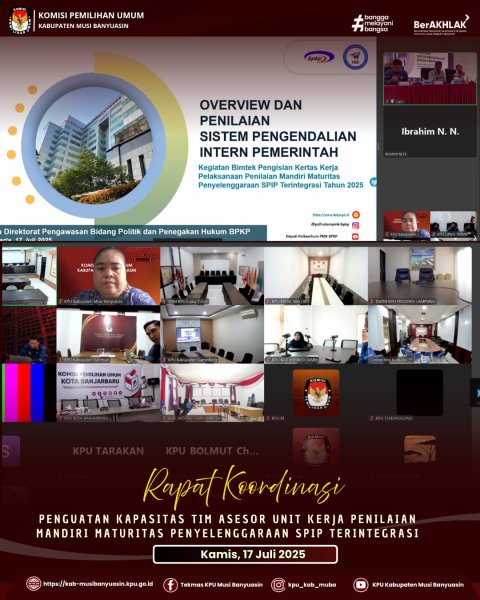 #TemanPemilih, Ketua, Anggota KPU Divisi Hukum dan pengawasan, Sekretaris dan Kasubbag Hukum KPU Kabupaten Musi Banyuasin menghadiri rapat koordinasi penguatan kapasitas tim asesor Unit kerja dan bimbingan teknis pengisian kertas kerja pelaksanaan Kerja Penilaian Mandiri Maturitas Penyelenggaraan SPIP Terintregasi Tahun 2025. Yang dilakukan secara hybrid, luring dan daring.