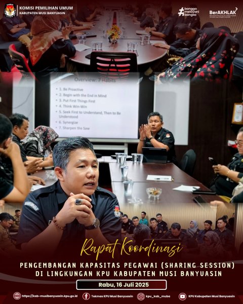 [18.57, 16/7/2025] Monica: #TemanPemilih, Plt. Sekretaris Bapak Erland Evriansyah memberikan paparan pada kegiatan Sharing Session dalam rangka mendorong pengembangan kapasitas Pegawai di Lingkungan Sekretariat KPU Kabupaten Musi Banyuasin.