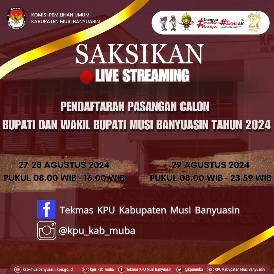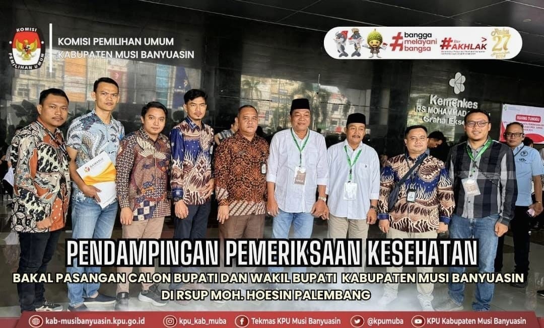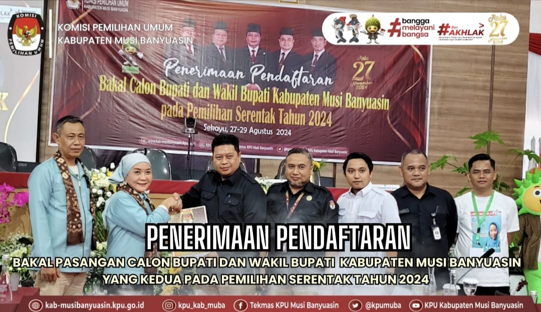 Selanjutnya Ketua KPU Kabupaten Musi Banyuasin Bapak M. Sigid Nugroho, S.Pd. S.H menyerahkan Tanda Terima Pendaftaran serta surat pengantar Pemeriksaan Kesehatan Di RSUP Dr. Mohammad Hoesin Palembang. Bakal pasangan Calon Bupati dan Wakil Bupati Musi BANYUASIN di jadwalkan Pemeriksaan Kesehatan pada hari Jum'at tanggal 30 Agustus 2024 Pada pukul 07.00 WIB.