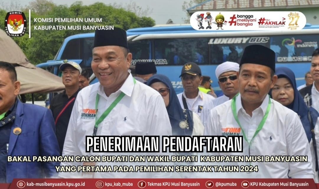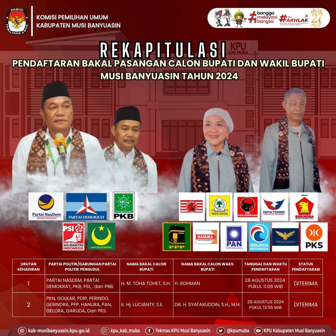 #temanpemilih, Pada hari kedua hadir bakal pasangan calon Bupati dan Wakil Bupati Musi Banyuasin pada pukul 13.56 WIB dengan di dukung oleh partai GOLKAR, PDI-P, PKN, GERINDRA, HANURA,PERINDO,PAN, PPP, PKS,GELORA, dan GARUDA. Berkas pendaftaran Bakal pasangan Lucianty dan Syafaruddin ini di nyatakan Diterima oleh Ketua Pokja Pendaftaran Bapak Muparid, S.T.