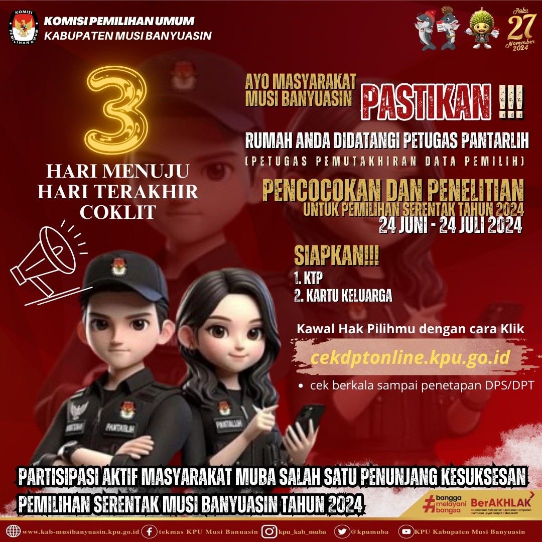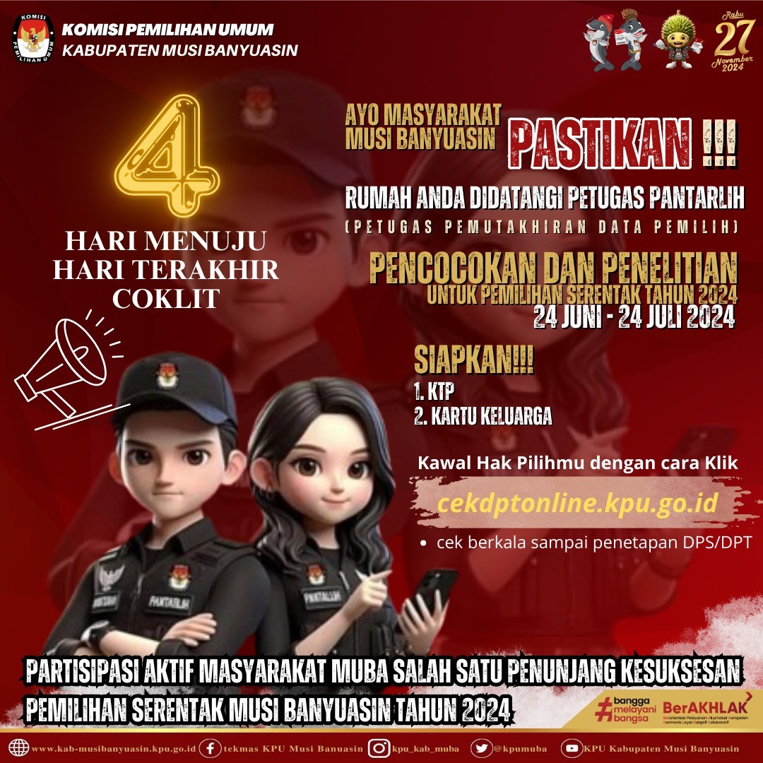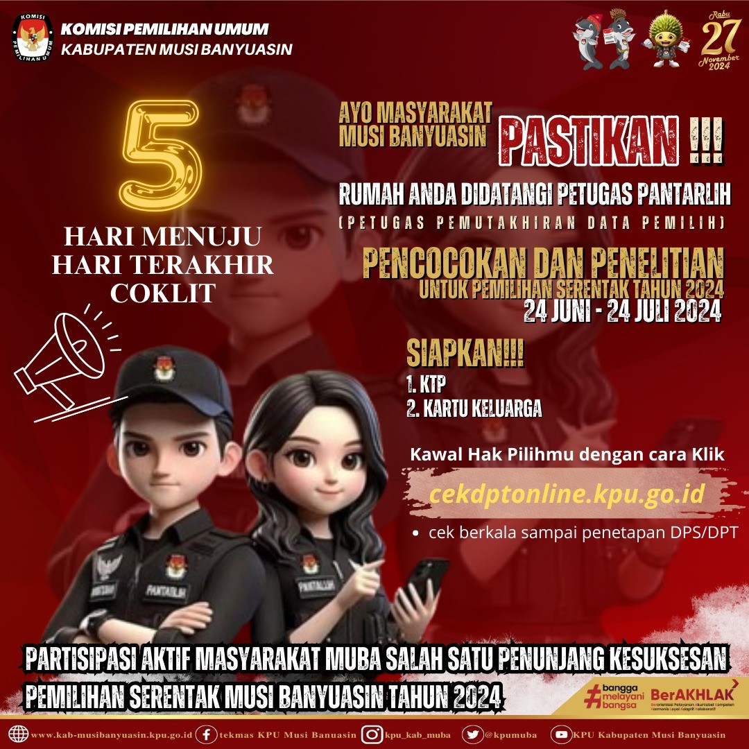 #TemanPemilih Bertempat di Halaman Kantor Komisi Pemilihan Umum Kabupaten Musi Banyuasin, KPU Kabupaten Musi Banyuasin mengadakan kegiatan apel pagi rutin, Senin, (22/06/24) Apel dimulai pada Pukul 07.30 WIB dan berlangsung dengan tertib dan lancar, Bertindak sebagai Pembina apel pada pagi hari ini, Sekretaris Komisi Pemilihan Umum Kabupaten Musi Banyuasin, bapak Dedi Irawan. Hadir pada apel pagi ini Kasubbag dan Staf Sekretariat KPU Kabupaten Musi Banyuasin, PPNPN, PKL dari Politeknik Sekayu dan SMK Negeri 1 Sekayu. Hadir sebagai pemimpin apel Jagat Saksana KPU Kabupaten Musi Banyuasin, Bambang Supriadi. Apel yang dimulai dengan menyiapkan pasukan, penghormatan kepada Pembina Apel, dilanjutkan laporan Pemimpin apel, Penghormatan kepada Bendera Merah Putih dan Amanat Pembina Apel. Dalam amanatnya Sekretaris KPU Kabupaten Musi Banyuasin mengingatkan kepada seluruh peserta apel untuk terus meningkatkan kedisiplinan, kinerja, kekompakan maupun Kerjasama tim guna menyukseskan Pemilihan Gubernur dan Wakil Gubernur Sumatera Selatan, Bupati dan Wakil Bupati Kabupaten Musi Banyuasin dan juga tetap pedomani setiap peraturan yang berlaku. Apel yang berjalan dengan tertib dan lancar ini diakhiri dengan berdoa bersama sebelum melakukan seluruh rangkaian kegiatan pada hari ini. #KPUMelayani -------------------------------------- Find Us On: Facebook: Tekmas KPU Musi Banyuasin Instagram: kpu_kab_muba Youtube: KPU Kabupaten Musi Banyuasin Twitter: @kpumuba Website: www.kab-musibanyuasin.kpu.go.id Alamat: Jl. Sekayu - Muara Teladan RT. 035 RW. 010 Kelurahan Balai Agung Kec. Sekayu - Musi Banyuasin.