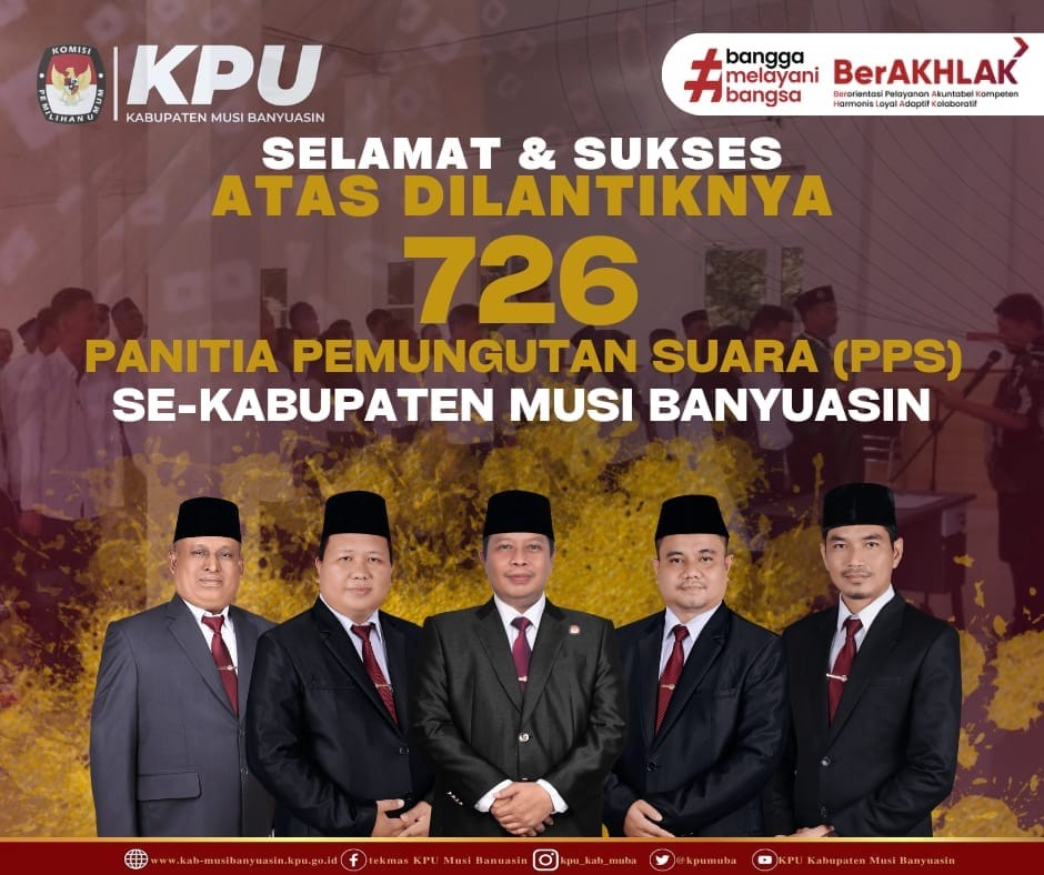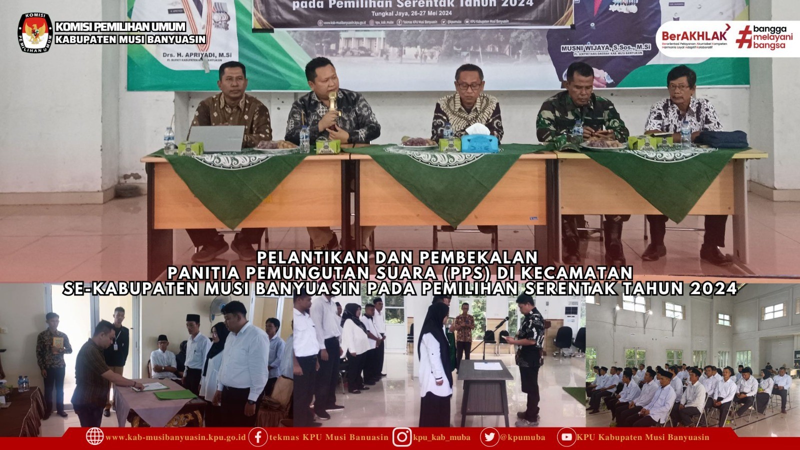 #TemanPemilih, KPU Kabupaten Musi Banyuasin melaksanakan Pelantikan/Pengambilan Sumpah Janji Anggota Panitia Pemungutan Suara (PPS) Terpilih untuk Pemilihan Gubernur dan Wakil Gubernur, Bupati dan Wakil Bupati pada Kabupaten Musi Banyuasin Tahun 2024 bertempat di Aula KPU dan Aula Kecamatan pada Minggu, 26 Mei 2024.