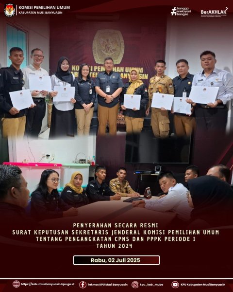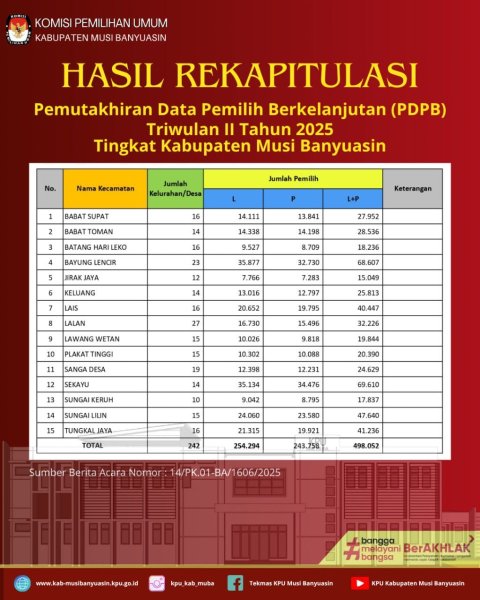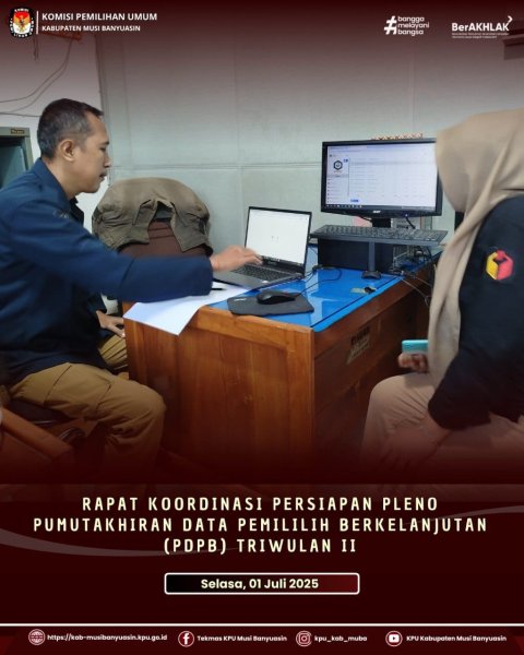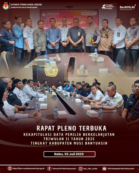 #TemanPemilih, KPU Kabupaten Musi Banyuasin menggelar Rapat Pleno Terbuka Rekapitulasi Data Pemilih Berkelanjutan Triwulan II Tahun 2025 tingkat Kabupaten Musi Banyuasin.
