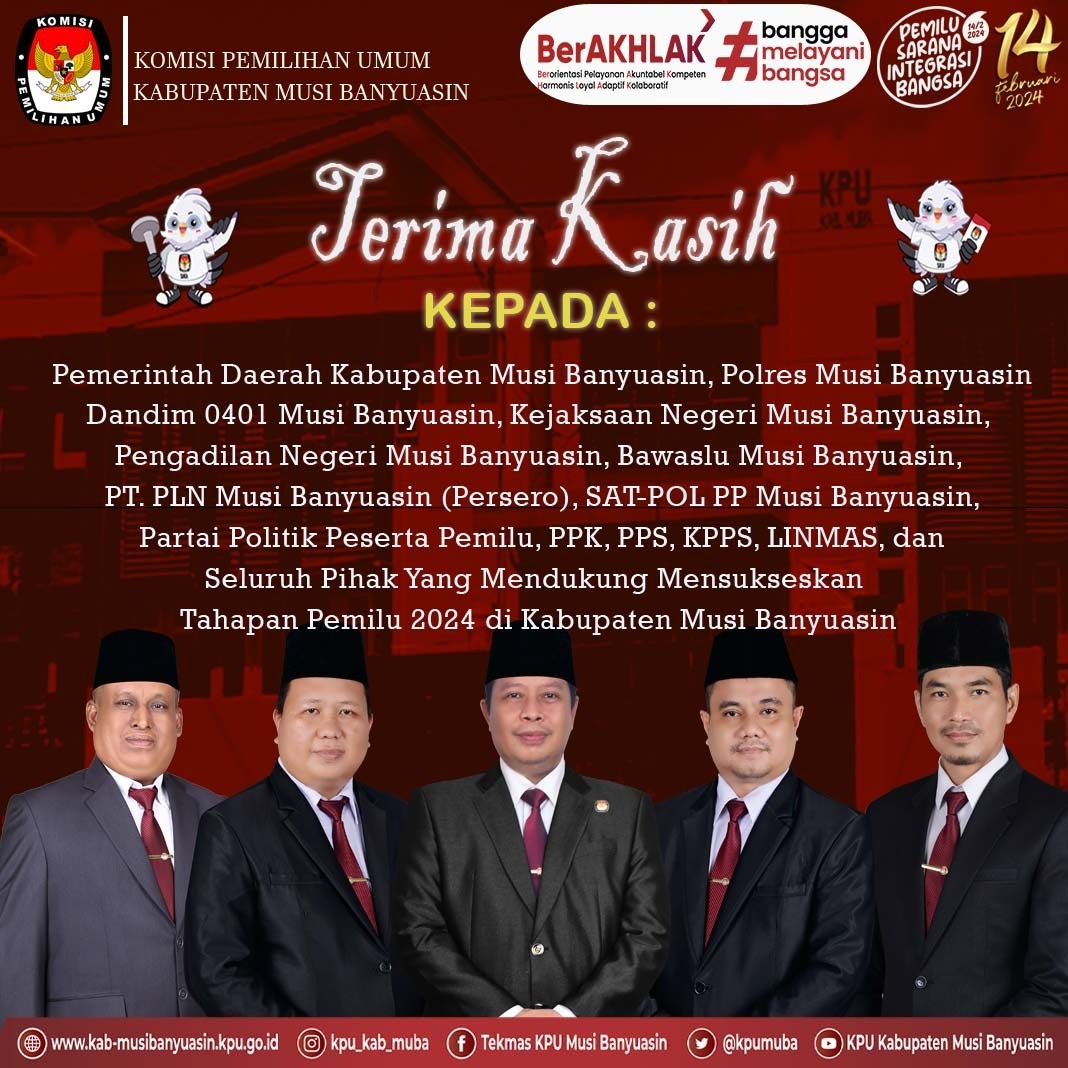 #TemanPemilih, KPU Kabupaten Musi Banyuasin mengucapkan Terimakasih Kepada Forkopimda Kabupaten Musi Banyuasin (Pemerintah Daerah Kabupaten Musi Banyuasin, Polres Musi Banyuasin Dandim 0401 Musi Banyuasin, Kejaksaan Negeri Musi Banyuasin, Pengadilan Negeri Musi Banyuasin, Dishub Musi Banyuasin, Bawaslu Musi Banyuasin, PT. PLN Musi Banyuasin (Persero), SAT-POL PP Musi Banyuasin, Partai Politik Peserta Pemilu, PPK, PPS, KPPS, LINMAS, dan Seluruh Pihak Yang Mendukung Mensukseskan Tahapan Pemilu 2024 di Kabupaten Musi Banyuasin beserta Pihak Pemerintah Kabupaten Musi Banyuasin serta PPK, PPS, KPPS dan Seluruh Masyarakat Kabupaten Musi Banyuasin