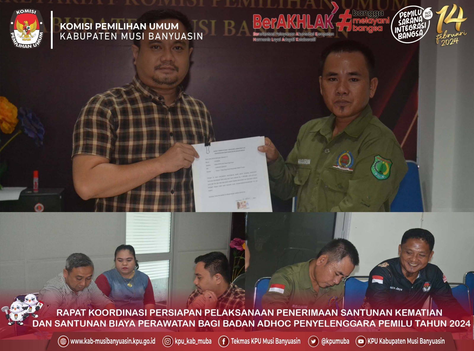 Serta santunan biaya perawatan bagi Ketua KPPS TPS 02 Desa Sugi Raya Kecamatan Babat Toman secara langsung diserahkan oleh Divisi Sosialisasi, Pendidikan Pemilih, Partisipasi Masyarakat dan SDM didampingi Sekretaris KPU di Ruang Rapat KPU Kabupaten Musi Banyuasin.