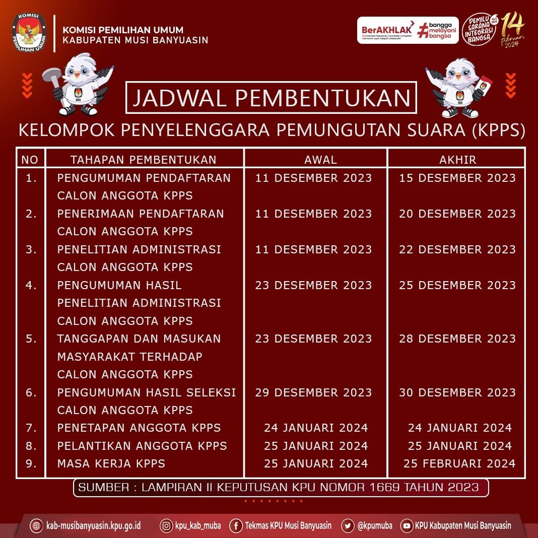 #TemanPemilih, KPU Kabupaten Musi Banyuasin mengadakan Rapat Koordinasi Tahapan Persiapan Pembentukan KPPS. Berdasarkan Peraturan Komisi Pemilihan Umum Nomor 8 Tahun 2022 Tentang Pembentukan dan Tata Kerja Badan Adhoc dan Keputusan Komisi Pemilihan Umum Nomor 1669 Tahun 2023 tentang Perubahan Ketiga atas Keputusan Komisi Pemilihan Umum Nomor 476 Tahun 2022 tentang Pedoman Teknis Pembentukan Badan Adhoc Penyelenggara Pemilihan Umum dan Pemilihan Gubernur dan Wakil Gubernur, Bupati dan Wakil Bupati, Walikota dan Wakil Walikota (4/12/23). Rapat Dihadiri Ketua dan Anggota KPU, Kasubbag Hukum & SDM, Kasubbag Teknis & Hupmas, Jajaran Sekretariat KPU Kabupaten Musi Banyuasin, ketua dan anggota PPK Se Kab. Muba yang diadakan di Aula KPU Kabupaten Musi Banyuasin #KPUMelayani ##PemiluSerentak2024 ------------------------------------ Find Us On: Facebook: Tekmas KPU Musi Banyuasin Instagram kpu_kab_muba Youtube: KPU Kabupaten Musi Banyuasin Twitter: @kpumuba Website: www.kab-musibanyuasin.kpu.go.id Alamat: Jl. Sekayu - Muara Teladan RT. 035 RW. 010 Kelurahan Balai Agung Kec. Sekayu - Musi Banyuasin.