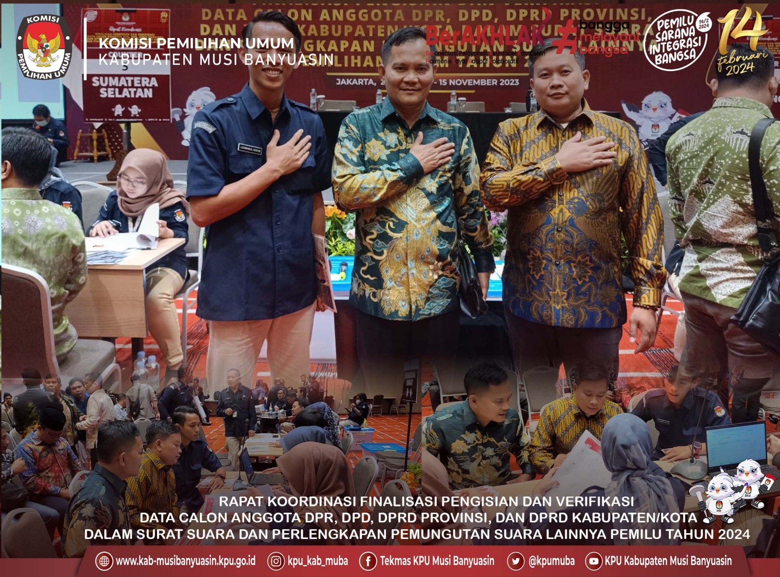 #TemanPemilih, KPU Kabupaten Musi Banyuasin menghadiri Rapat Koordinasi Finalisasi Pengisian dan Verifikasi Data Calon Anggota DPR, DPD, DPRD Provinsi, dan DPRD Kabupaten/Kota Pemilu Tahun 2024 dalam Suarat Suara dan Perlengkapan Pemungutan Suara Lainya. Dihadiri oleh Ketua, Anggota KPU Divisi Teknis Penyelenggaraan dan Operator Silon, pada 7 November 2023, bertempat di Hotel Grand Mercure Jakarta.